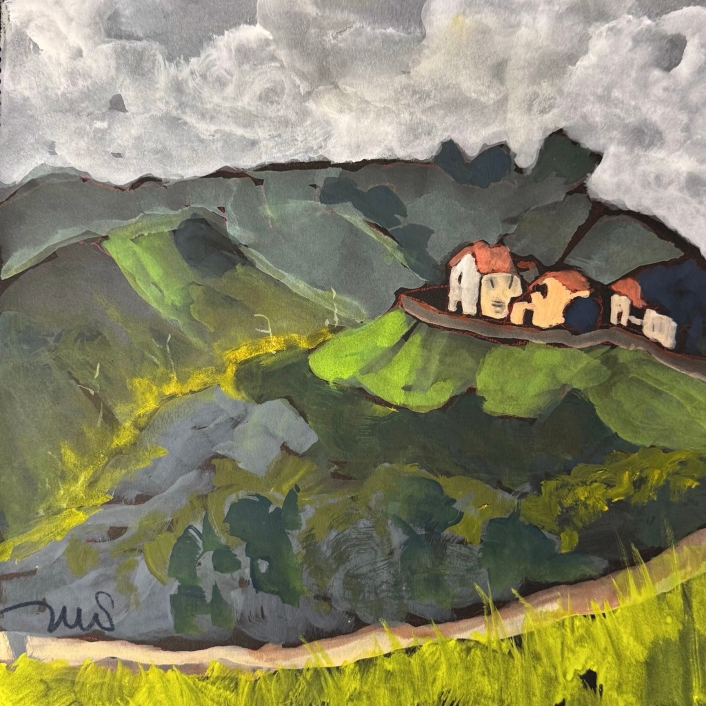 Our Thursday group painted from the patio of one of our members. The sky in the west was heavy with clouds, and the coastal sage scrub and new greens seemed happy from our recent rains.