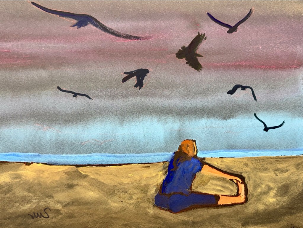 We are in San Pancho, Mexico, for a winter vacation with my extended family. We have a large five-bedroom condo with beautiful views in every direction, and lots of space for our art materials. This is our first full day, and we eased into it slowly. One of my sisters, a birder, sat in bed, identifying and drawing the local birds. She made a perfect subject for my sketch. I like that my painting captures her focus and the scene beyond the balcony.