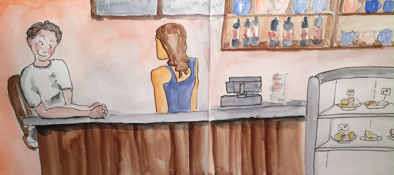 This is the fourth day I have worked with the same basic sketch. At this point I believe I need to set it aside and work on other subject matter, as I am still confused about how to convey the emotions of the customer and barista, which is the point of all this study. I feel the two figures are better drawn and better tinted with watercolor. However, the composition seems to have lost some of the spontaneity of the original sketch. The good news is my other work is conveying more emotion and tomorrow I will blog about this.