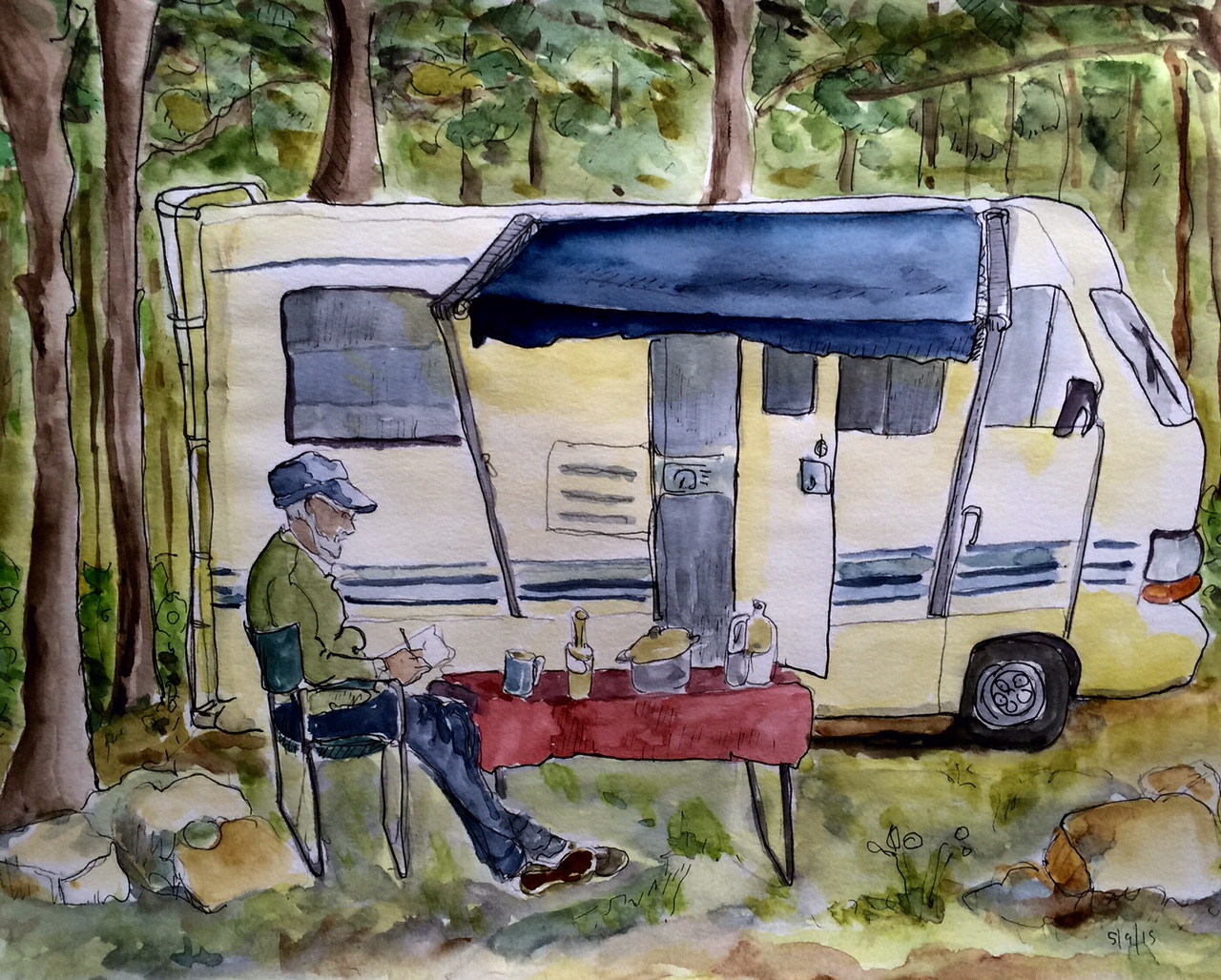 So, here we are, a figure, a table, a camper and two trees, all gathered on a page.