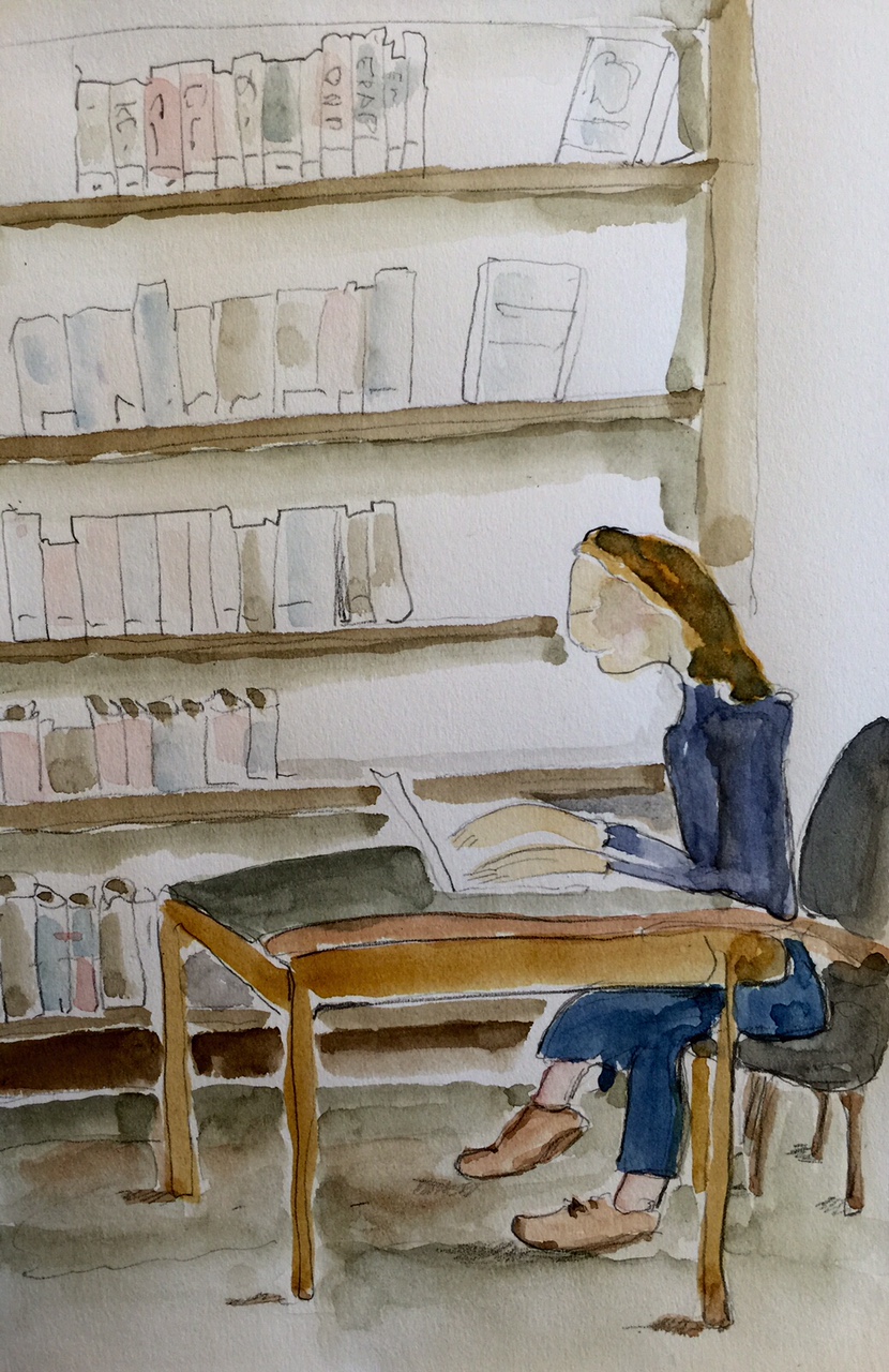 Today I went to the library in search of books and subjects. My intent was to sketch figures in a setting that allowed me to work on showing depth within the sketch by using lights and dark values.