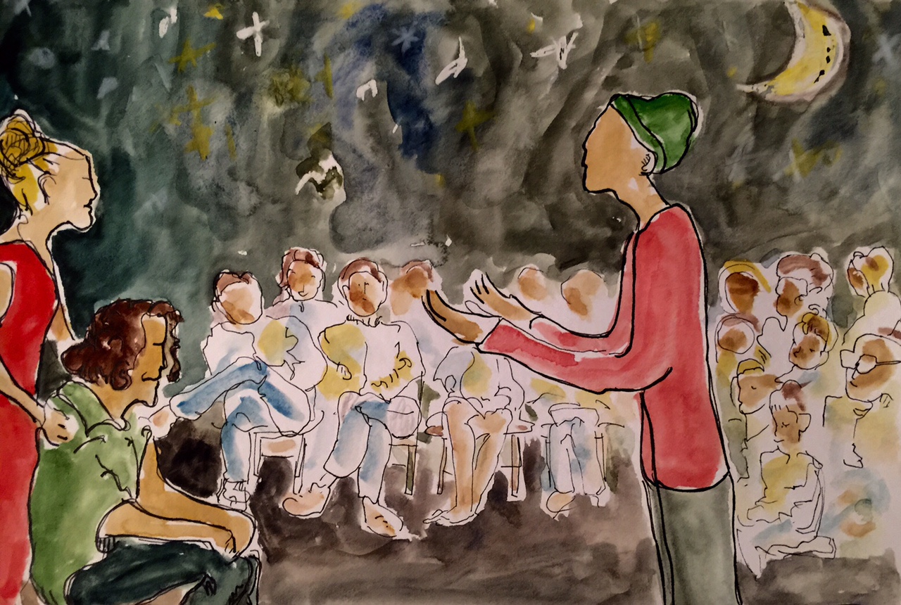 Today I had a great opportunity to use color values to add depth to a sketch. We attended an outdoor performance of A Midsummer’s Night Dream in the park. It was performed in the round so I was able to sketch the audience on two sides of us, as well as the performers. I sketched with a pen and then after the performance added watercolor.There is a clear story that is being told in the sketch with body language, color, value and line.The faint color and line that describe the audience contrasts with the strong color and line for the three performers and adds depth to the sketch. I was able to show a foreground, middle-ground and background and to make a night sky that goes with the play and the actual performance. I may redo this sketch tomorrow as I wish I had put in faint arches in the night sky.