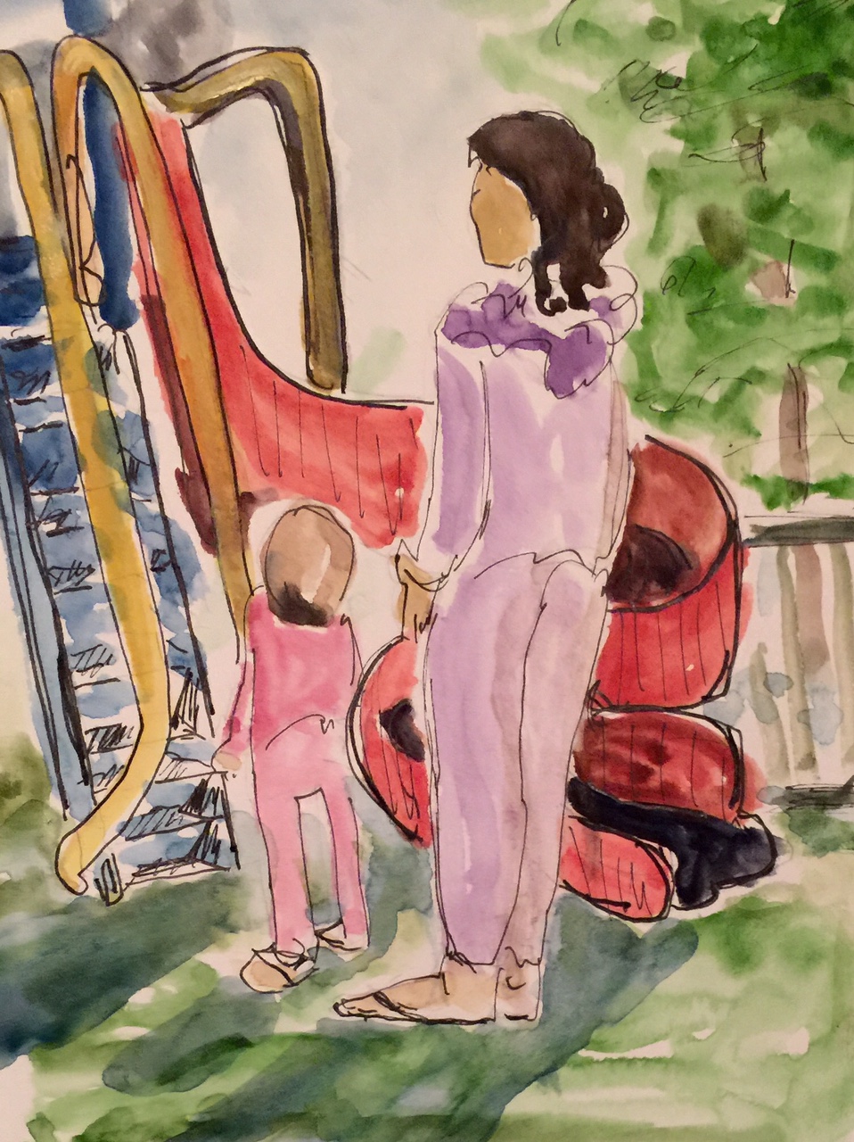 This morning I sat and did thumbnail sketches of children and their families on a playground. Capturing the differences between child and adult in a small thumbnail took significant effort and made me glad I was sketching in pencil. I was fascinated by a child looking with hesitation at the steps up to a slide and by her mother looking at her child and did a very quick sketch in color of the two. The child never went up the ladder and the mother stayed by her side, neither encouraging nor dissuading her child. Later I tried to redo this sketch and add a better slide. I did get a better slide but was not able to replicate the body language of the child and mother.