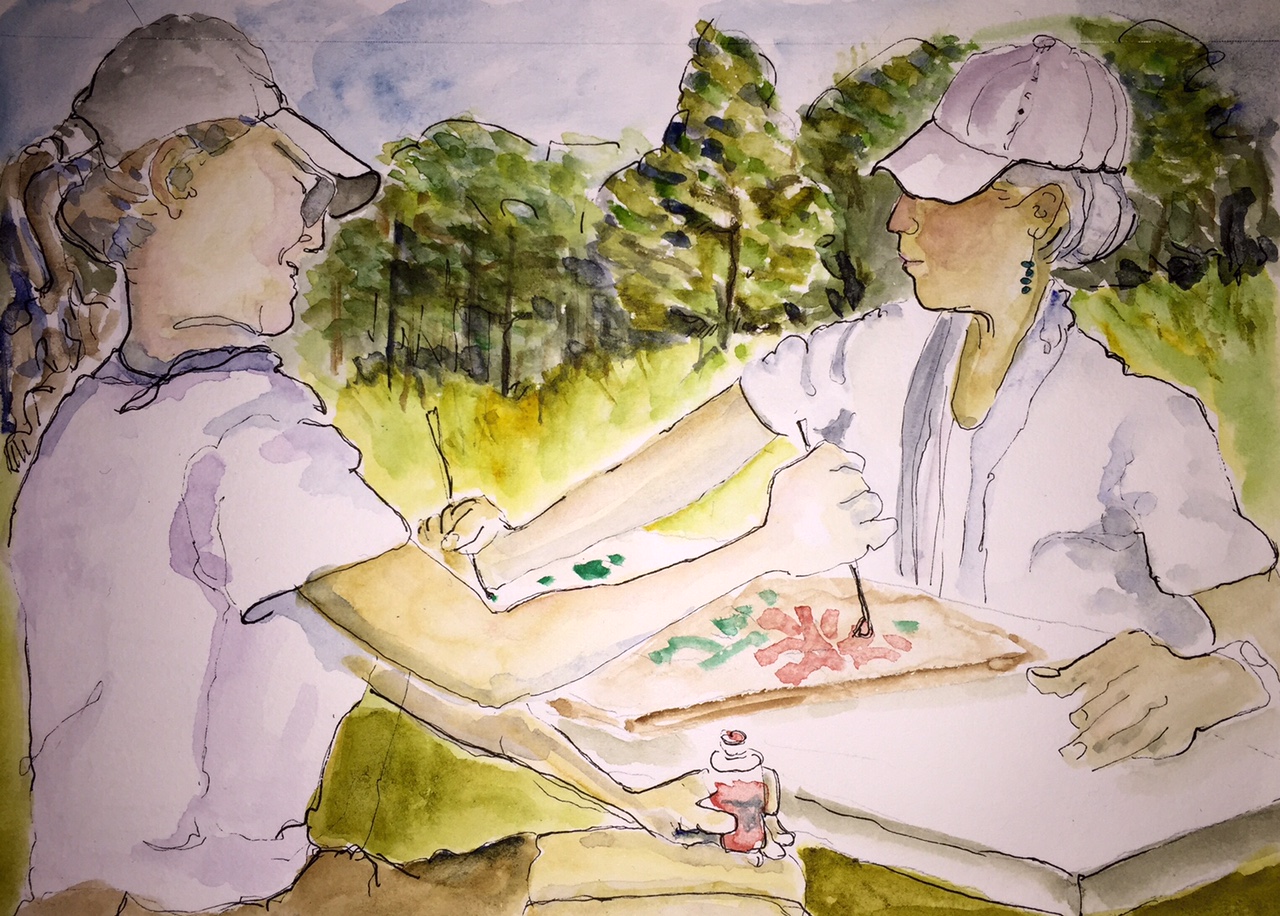 My big goal is to tell a story through image and today I had a great opportunity to do so. This afternoon we repainted some outside art here at my brother’s property. Here is a sketch of my two sisters working outside on the same piece, from opposite sides of a table! Their position and harmony reminded me of the Escher piece where the hands are drawing themselves. That they could manage this while enjoying themselves says a lot about who they are. I come close to capturing the congenial interaction and the maneuvering needed to paint around each others arms by the awkward position of their painting arms. I partially showed their pleasure in the work and the enjoyment each was taking in being there with the other through the facial expression of the sister on the left. Their focus on the work in spite of all the commotion is shown somewhat by the expression of the sister on the right. I did not capture their ongoing chatter and may try this sketch again with their mouths in a talking position. I drew the sketch in ink and finished most of the watercolor in the field with my sisters.