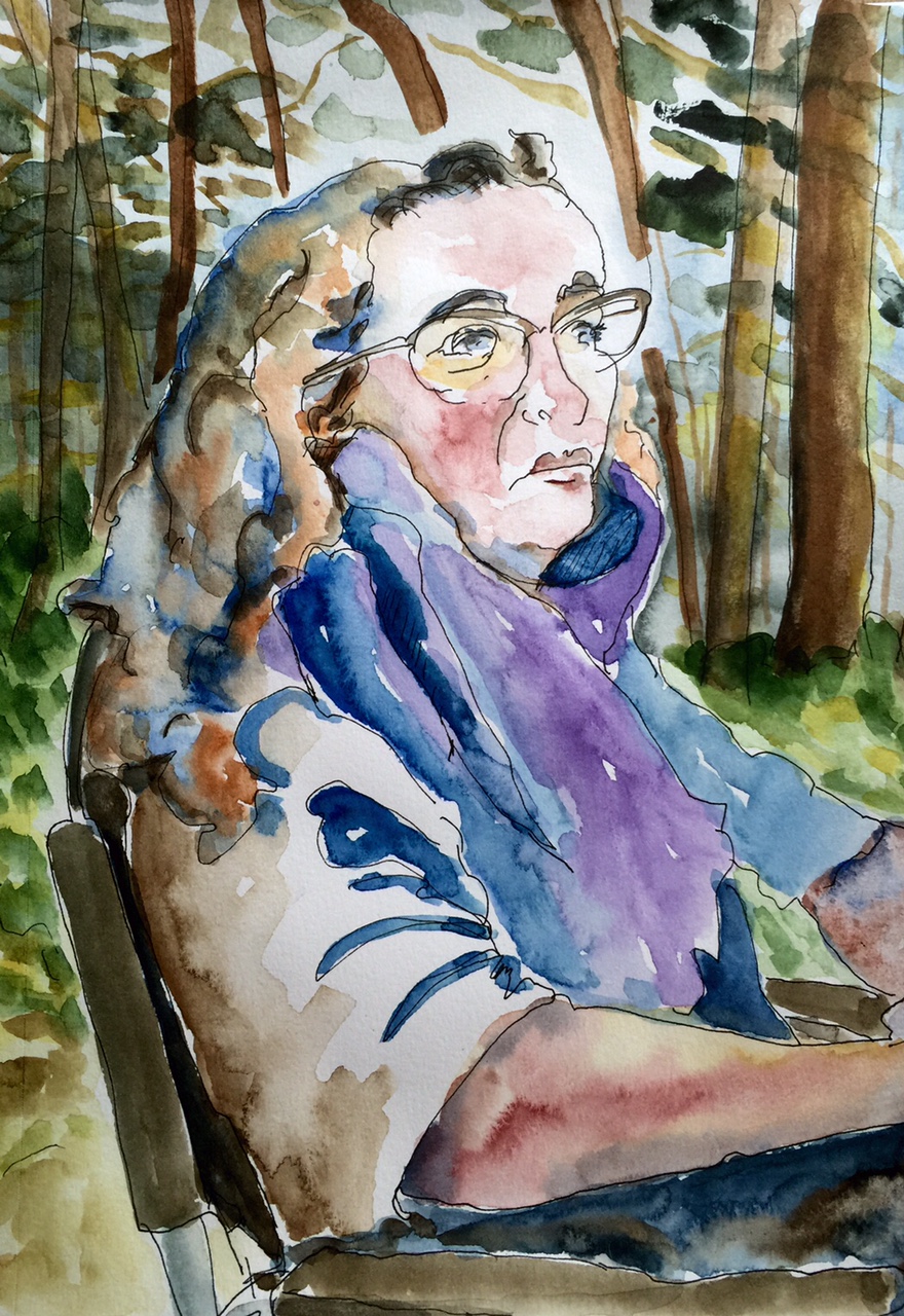 This morning I sat with many of my relatives, including my cheery sister-in-law MJ. I get a lift from MJ’s wry sense of humor and could listen to her stories all day. As we all caught up on our news and exchanged stories, MJ did needlework and I drew her. Imagine my surprise when I looked over the sketch below and saw that I had a sketch that not only strongly resembled MJ’s mother, but also caught a bit of melancholy that I had not overtly noticed when sketching MJ. I think it is the lift of her head, her open blue eyes, and the violet scarf that convey the pensive mood. And I am wondering if the strong blues and reds I used in the skin tones and hair highlights also contribute to a sense of sadness. I will do more work with these colors as I would love to be able to intentionally create this kind of emotional impact.