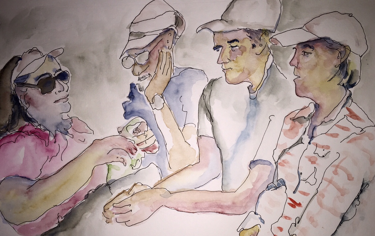 I keep a sketchbook as a way of remembering and understanding. This morning I sat and sketched four relatives, squishing them all into the same sheet of paper, not caring too much about the impossible overlapping of the space and people. It is a collage of people, moments and feelings from the last day of our family reunion. The two men were working on a puzzle, my sister-in-law on her needle work and my sister was sharing a story. I did not quite capture how pleased we were to be there together, perhaps because I put too much on this one small sheet of paper. I continued using strong reds and blues for the skin tones and just hinted at the color in the clothing. And I am more comfortable with using a range of values on the skin. I am glad I was able to capture so much of our reunion in my sketchbook.