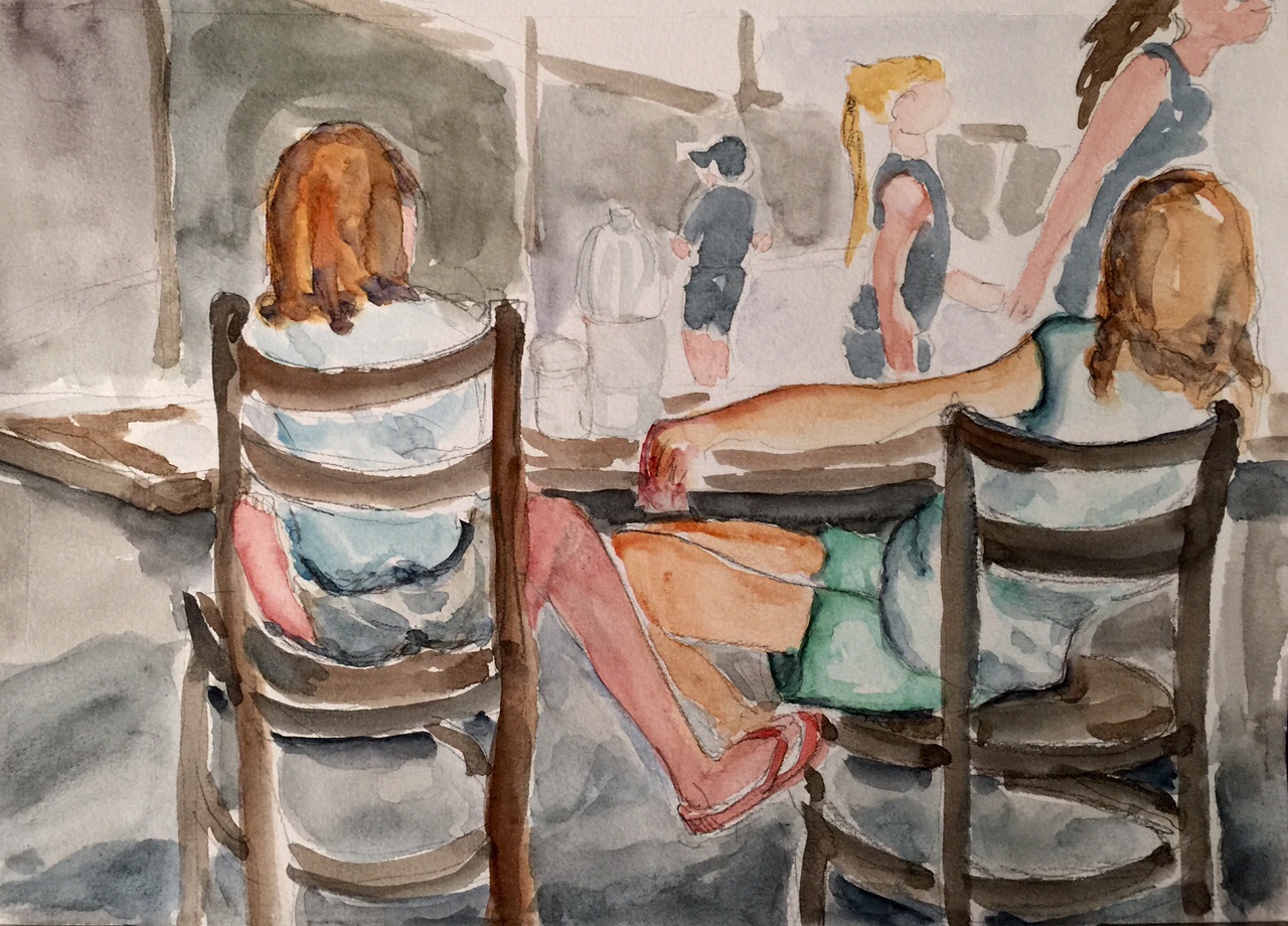 My goal this week is exaggerating body language to tell a story but there was no need to do so with the two subjects of this sketch. I stopped for coffee in the middle of the day and noticed two limber sisters lounging as they each ate a doughnut. I was astounded by and envious of their ability to contort their legs and still stay upright. I caught the movement of the three background figures and the contrast of their activity to the girl’s relaxed sitting. I blocked in greys for the rest of the store and went too dark. I like that the composition has several triangles in it; the bank of windows, the three background figures and the left corner of the table through the legs and right chair. I may come back to this sketch and improve it by replacing some of the grey color in the background and modifying the arm of the older sister so that it clearly hangs over the back of the chair.