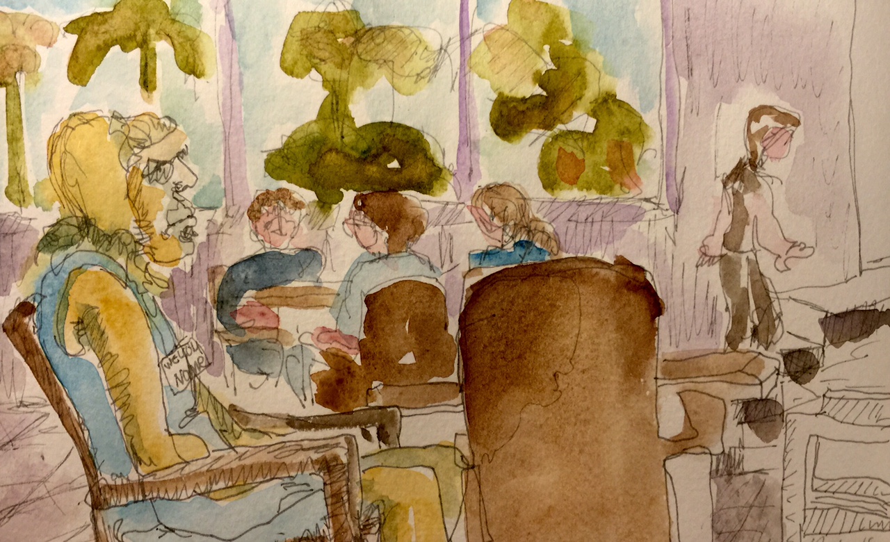 Using line to convey a story continues to be my focus this week. To show the woman’s dejected body language, I used a 0.5 grey line marker and emphasized the expression around her eyes, neck and arm by a scribbling hatch marks. I used a 0.1 grey line marker for the rest of the sketch and put in flat washes for the other people and furniture, using muted color to complement the somber mood of the woman. I wish I had left more room for two more table groups, it would have conveyed her aloneness better.