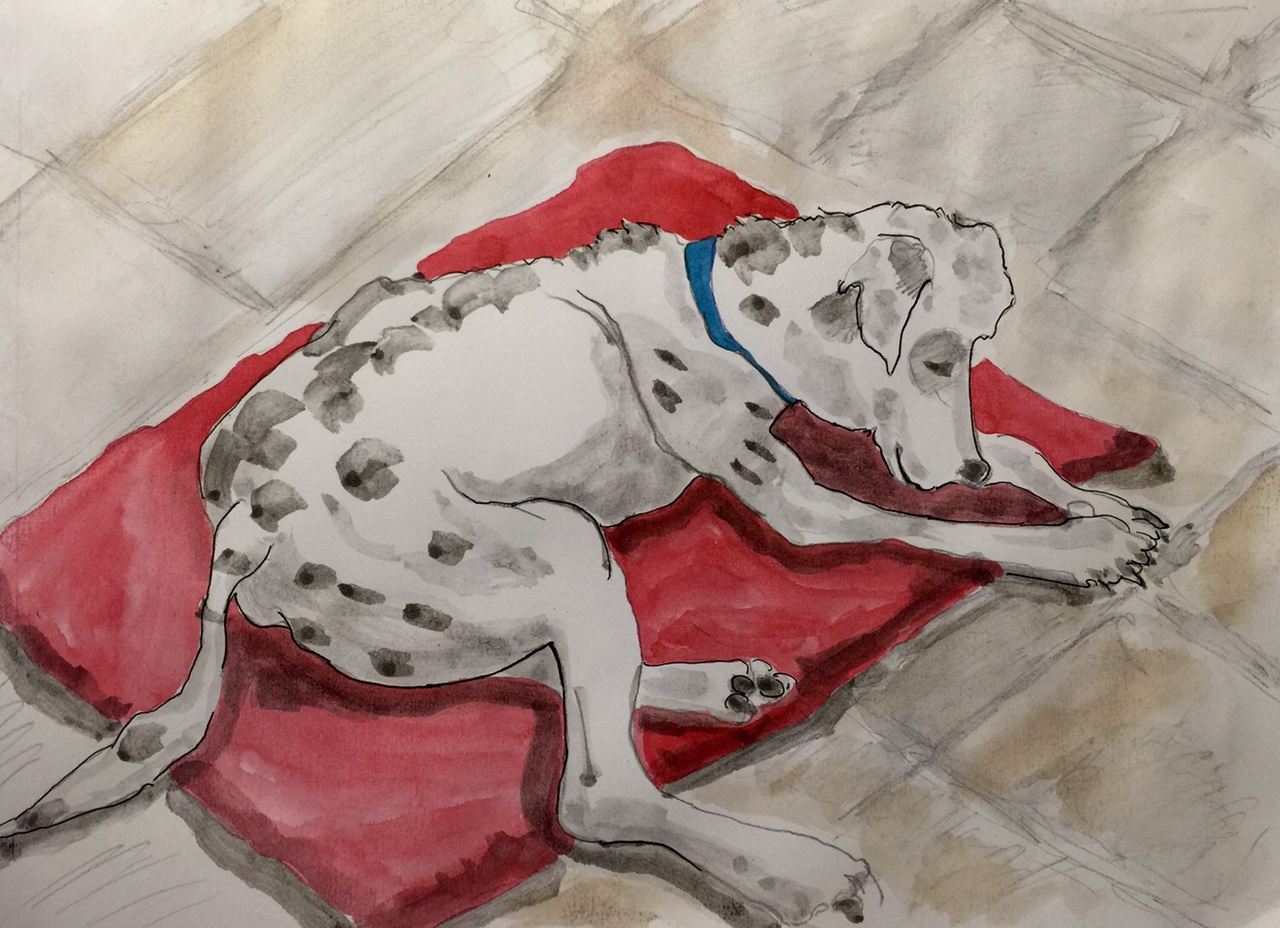 Our dog Luke seems very happy to be home with his assortment of beds throughout the house. Today I used line not only to draw Luke and his bed, but also to suggest the texture of the stone floor, the dog bed and Luke’s fur. I used a soluble graphite pencil, indelible ink and watercolor.