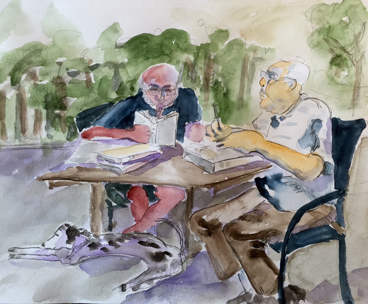 I have been wanting to convey people thinking together. We had an early arrival for dinner Friday and as our guest began to socialize I was able to capture two sketches of people thinking together. I did not get the hand waving but I think the way they use books and paper to support their discussion rings true to the purpose of their interaction. I sketched in pencil and watercolor, then later went back with more color. The line is subtle, mostly grey, but used throughout the sketch. I will post the second sketch later today.