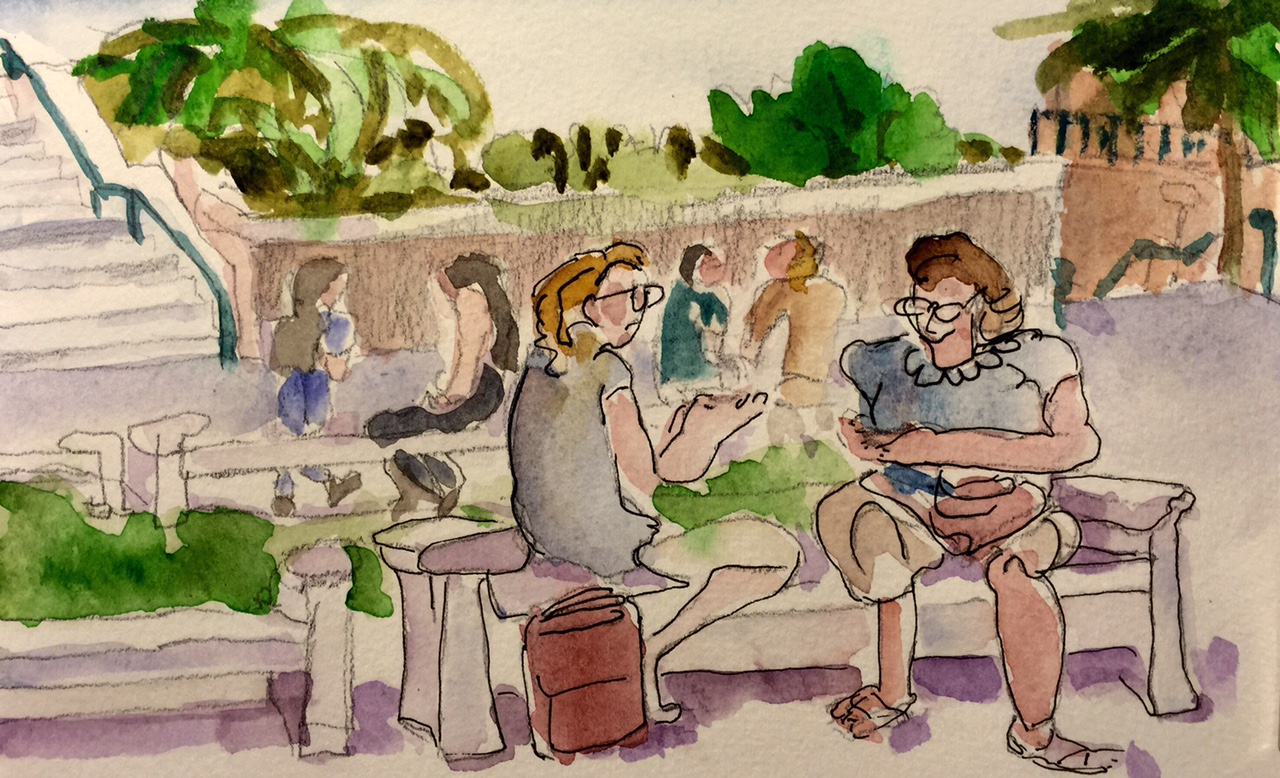 I walked back up to the college today. It is a great place if you are a sketcher looking for people to draw. I sat across the walkway from two students and was able to capture the gist of their expressions and posture in several different sketches. I chose this one to post because I caught a bit of a dejected ‘that’s not right’ attitude from the figure on the left and a proactive ‘I have to figure this out’ from the figure on the right. Altogether, the sketch conveys a note of confusion about what the two women should do next, on this second day of fall classes. The simple ink lines for the two figures bring them forward and contrast with the less defined other figures. The light was harsh and I think I would have shown this better if I had used yellow in place of the purple and blue shadows.