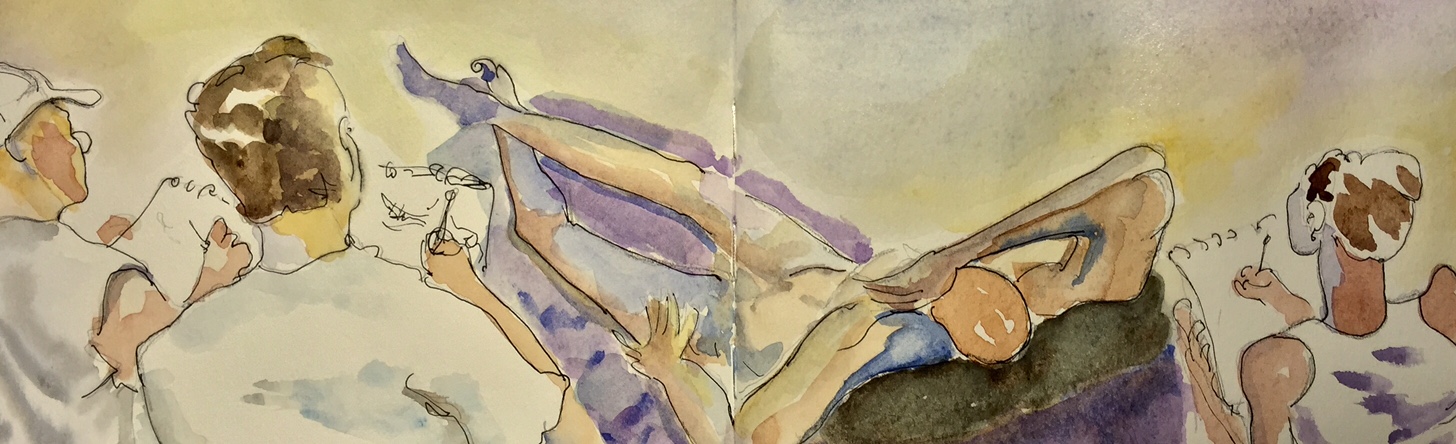 I somehow managed to sketch the 19 poses, mostly using watercolor, pen and pencil. Although I intended to deliberately practice using ambient light to strengthen my sketches, I became confused about the lighting in the studio setting. The lighting was not natural, all the windows and doors were draped, and a few spotlights illuminated the model and cast strong shadows in multiple directions. I ended up just putting down color as best I could.