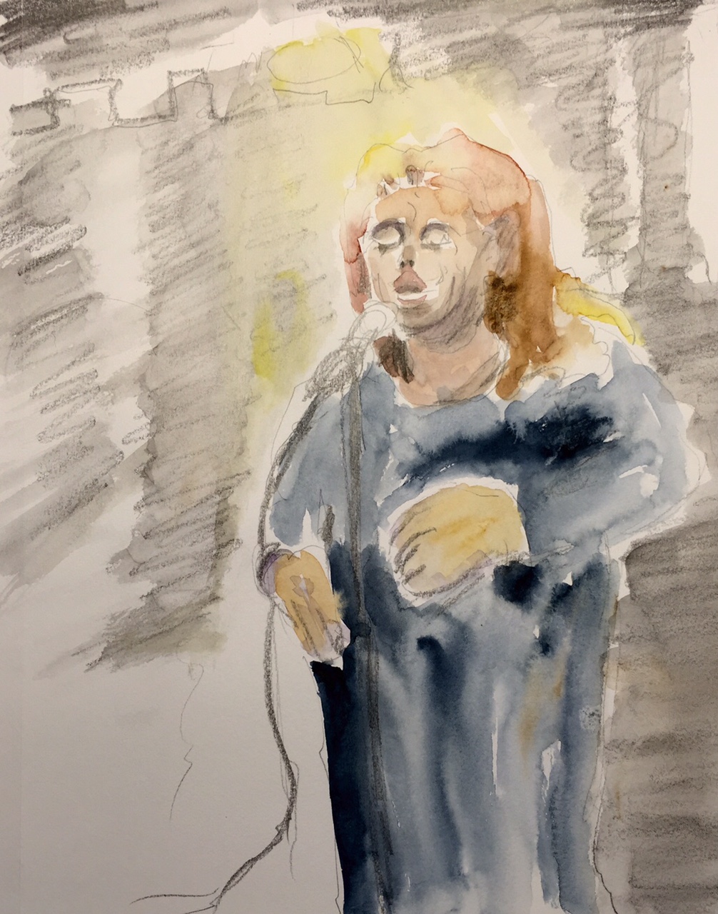 Being an audience member is a wonderful opportunity for a sketcher, so I was delighted to accept an invitation from a friend to attend her recital, the culmination of a 10-week course in singing for people who believe they are unable to sing. I was also eager to attend as an educator because I am fascinated by teachers who cause transformation in belief and performance. I was moved to see and hear 14 individuals take on the challenge and knew I was in the presence of a very powerful teacher. The message I wanted to convey in this sketch is of a performer giving it her best. The closed eyes, slight frown, cast shadows, lifted chin and hand position help send this message.