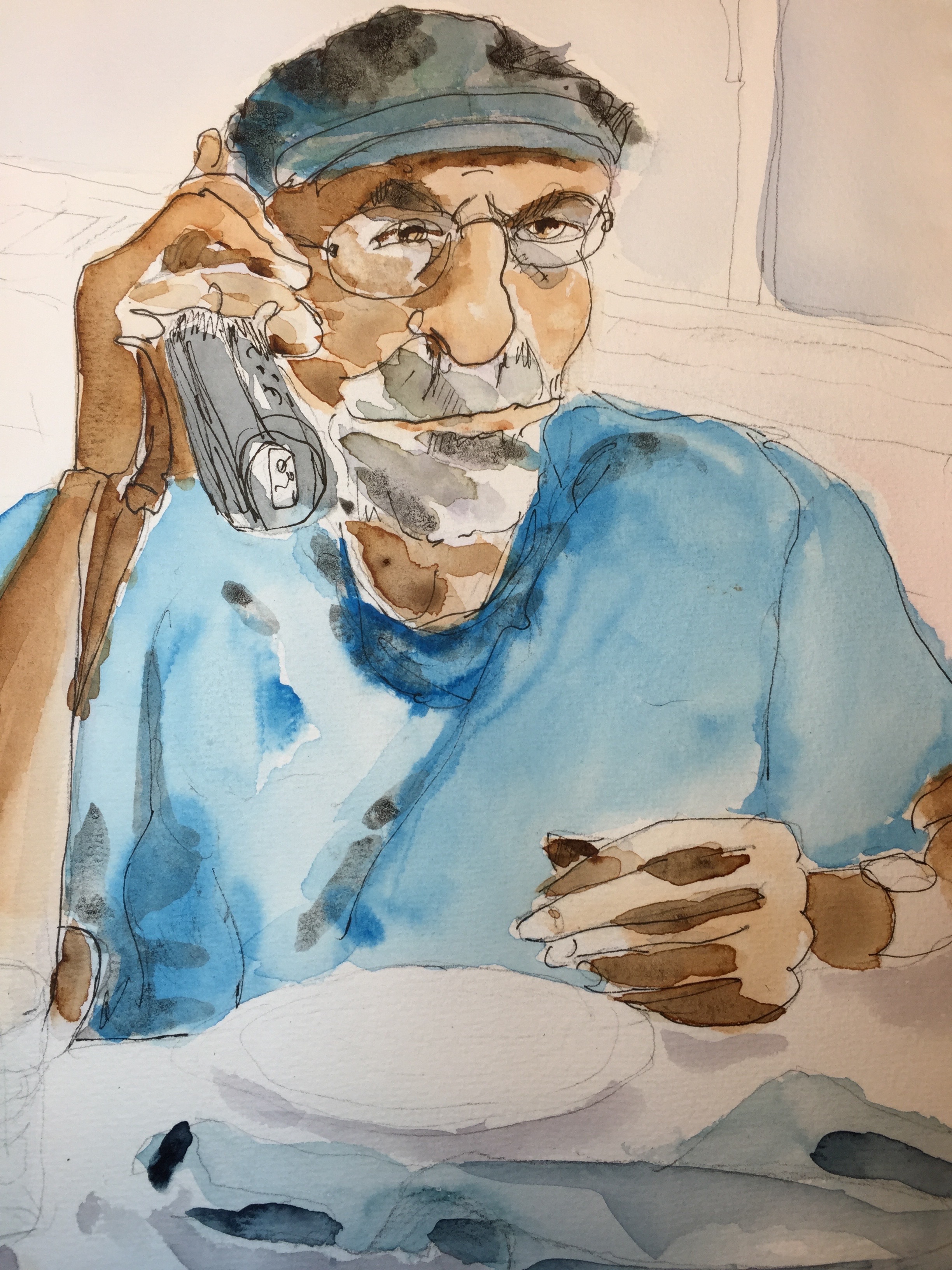 I am fascinated by the different looks exchanged as people interact with each other using eye contact. In this sketch tonight, the listener was on the phone and I noticed that although there was no visual communication, that the listener was still giving off strong signals that he was listening closely. He did this by holding still, staring intently into space, raising one eyebrow, and clasping the phone tightly. He definitely showed the look of listening, if only to me. I used line, shadow and highlights to develop the facial expression and body language. I also experimented with using splashes of paint for emphasis and shadow, particularly in the left hand and beard. My plan for deliberate practice for the coming week is to develop better skills with splashes of paint.