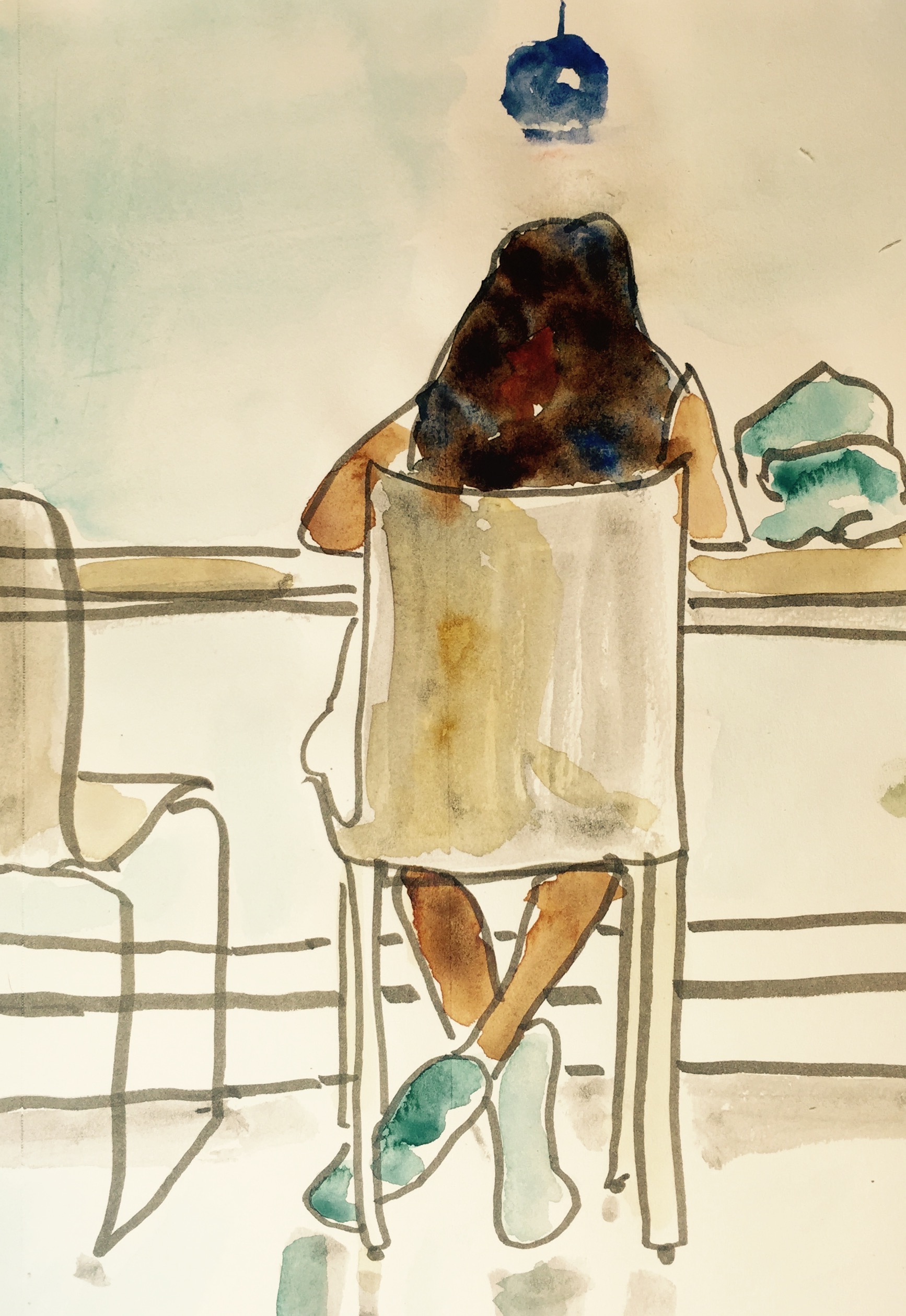 I stopped by the library and while I was making my selection, I noticed a student tapping her foot over at a desk facing the wall. She was intent, focused and tapping away. My attention was also caught by the reflection of the blue soles of the student’s tapping shoes in the polished floor. I did not capture the tapping in this sketch but did capture a bit of the student’s focus with the angle of her shoulders and head. I overdid the splashes of color in her hair and got just about the right amount in the other parts of the sketch, particularly in the left leg, the right foot’s shoe and the chair. After the sketch was dry, I made a quick exit, leaving the tapping sounds behind.