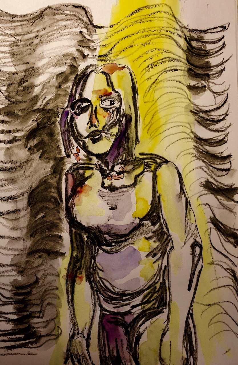 This performer was bravely hesitant in her performance and this comes through in the sideway glance she gives to her right as though she is looking for people who might be laughing at her.  She leans forward uncertainly, not quite standing up straight and not quite committed to being on stage, somehow sending a message of bravery in the face of uncertainty. I used a water-soluble pencil, yellow, purple and red paint, and the white of the paper to reinforce the idea of performance on stage under lights. The strong colors and contrast reinforce the message of unease by making the lighting stark.