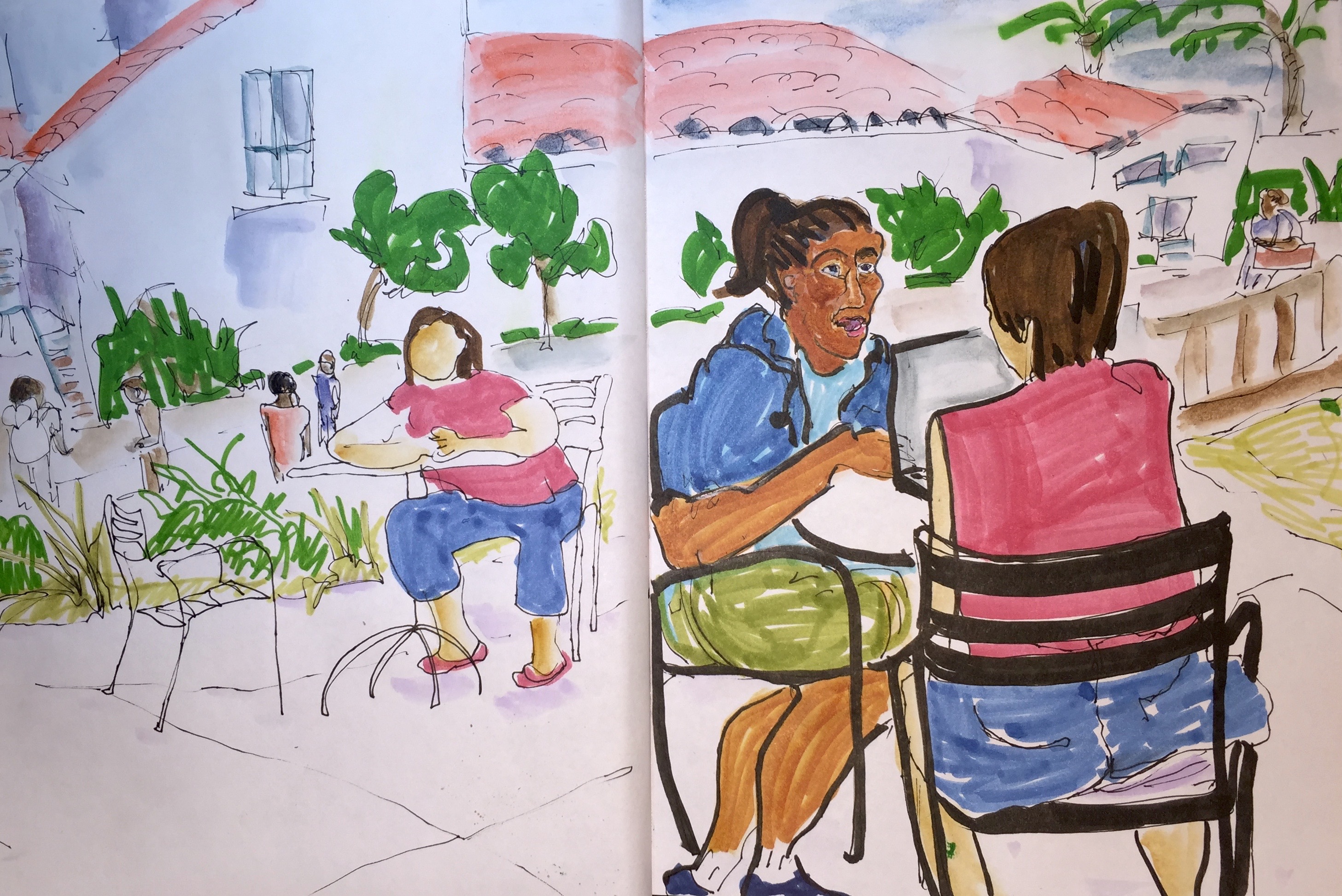 The weather was perfect today and students were outside enjoying it as they studied, which helped me along with my goal of sketching groups of people in a setting. I again used markers in place of my watercolors and am liking the ease of use. I need to be more thoughtful as I fill in color since the strokes remains visible after it dries. I like the texture of the stroke marks in the shorts that the figure on the right is wearing, and wish I had colored in the middle figure using similar strokes. The study group’s enthusiasm for anthropology was infectious and the parts I overheard made me want to be a student again.