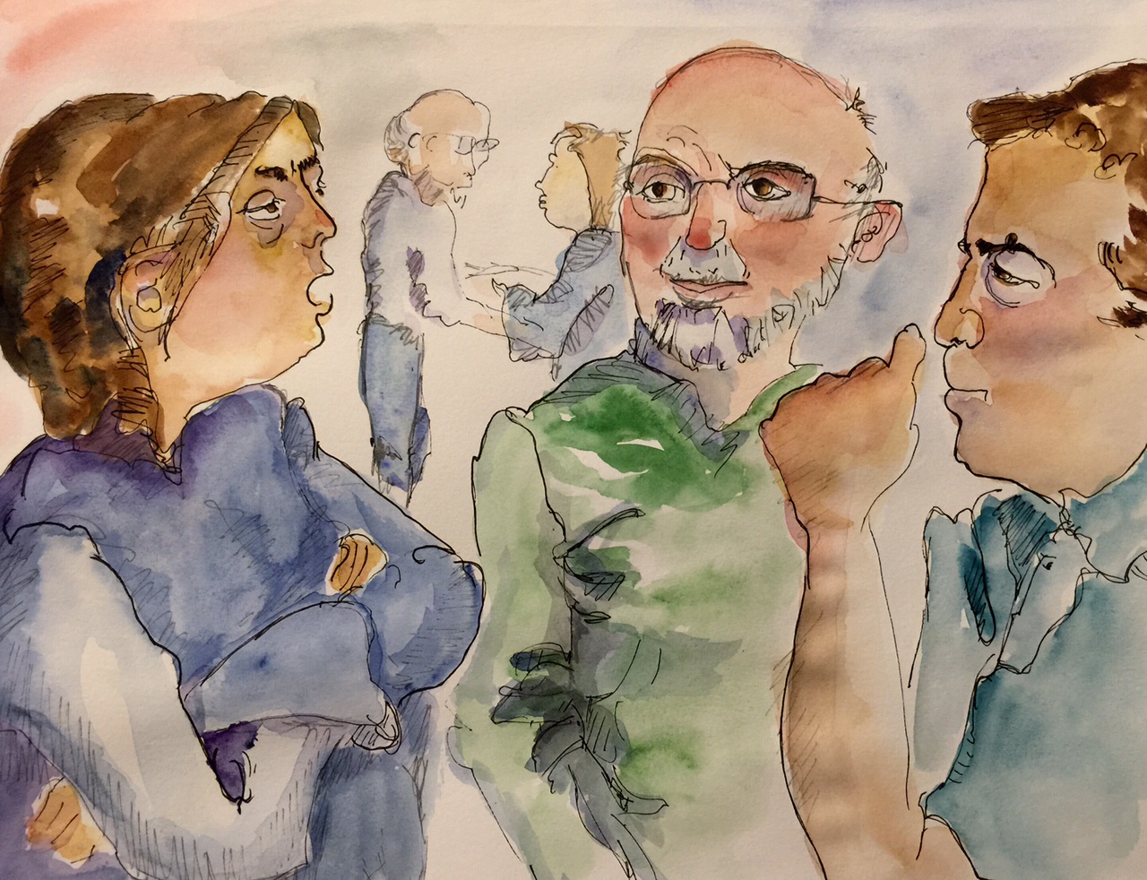 My deliberate practice goal this week is to convey a story through the interaction of a group and I caught a few people exchanging opinions this evening in our home. The eye contact, open mouths, and arm positions indicate talking and listening and also something about how the opinion is being received. The exception is the green figure who appears to be somewhere else mentally. I used pen and watercolor.