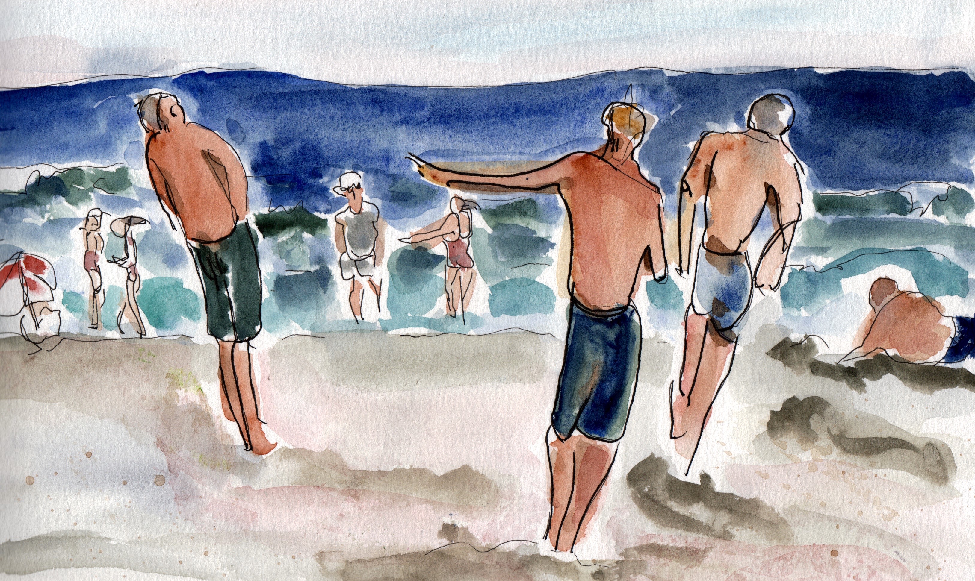 I went to Mission Beach today and sketched away the day. The sea was energetic and so were a great many of the beachgoers. Even though the runners have a gravity defying angle to their posture, I like this sketch because of their enthusiasm about being there, which can be seen in their body language, especially in the lift of the central figure’s arm.