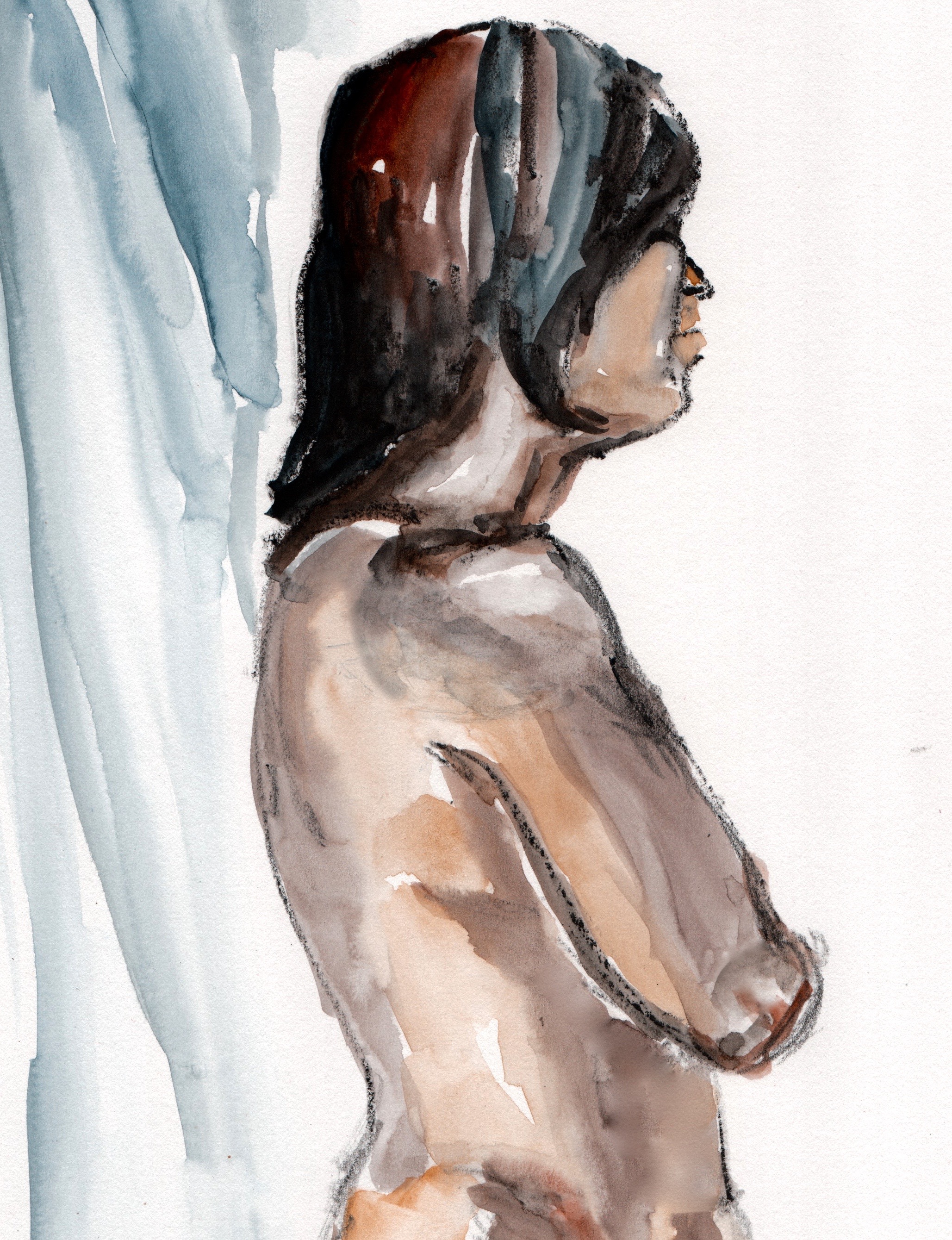 Today I thought about line as I sketched. I used a black water-soluble pencil to define the body outline. I also made thick lines with watercolor in the model’s hair, and used the hard edges of the watercolor to give shape to the body.