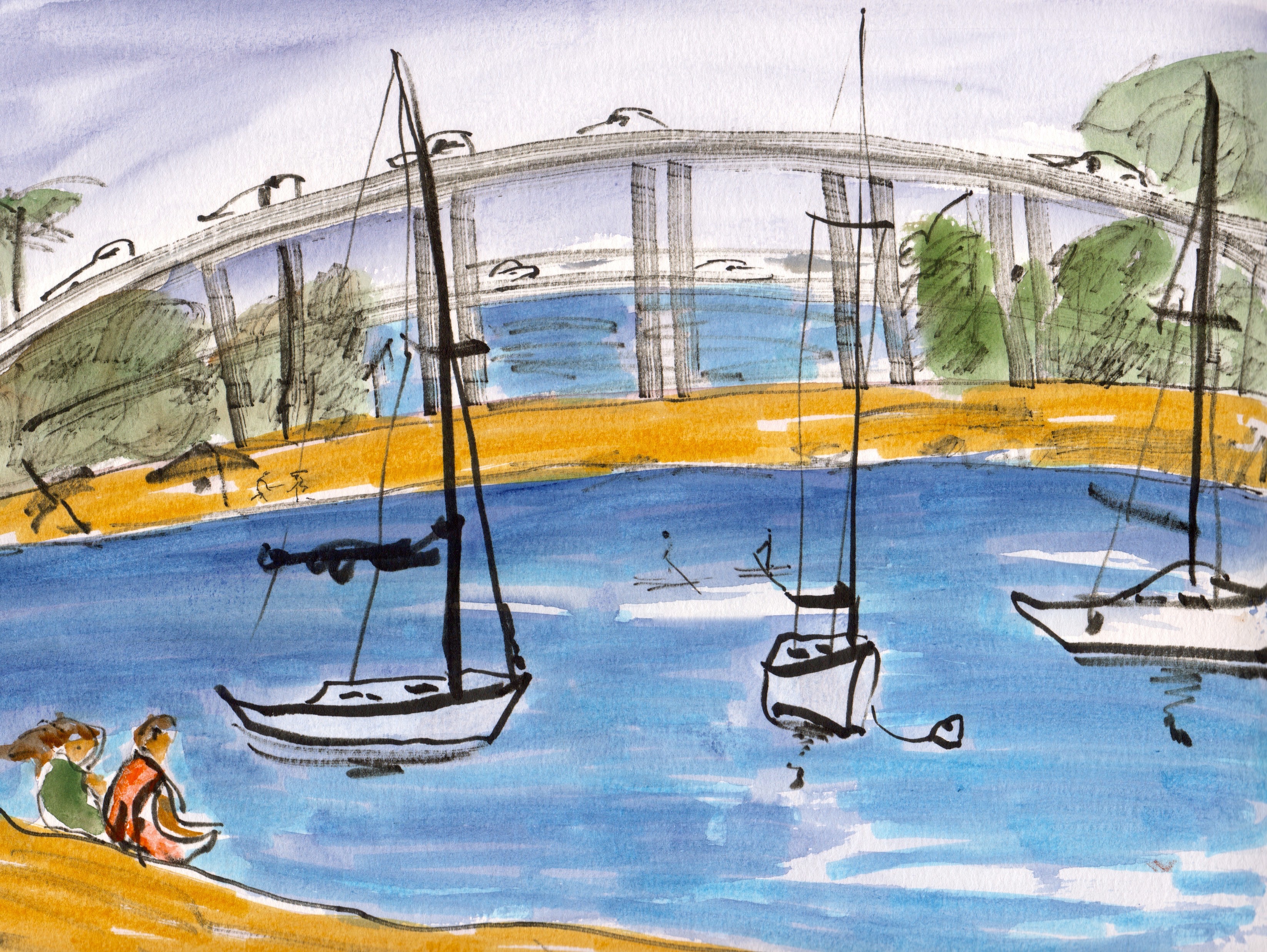 2. The dark outlines and non-coloring of the man made objects (boats, cars) makes for a nice contrast. I especially like the clean form you chose for your boats 🙂