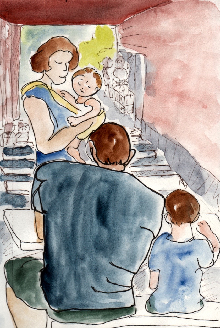 I am doing quick sketches everywhere these days. This one is from the food court at Costco in San Diego. A sweet little family shared some ice cream just long enough for me sketch them. I liked the way the four heads make stair steps down the page. I don’t know why I have such flimsy paper in my purse, it was hard to work with when I added watercolor. The paper just withered up at the touch of water. I used pen, pencil and watercolor.