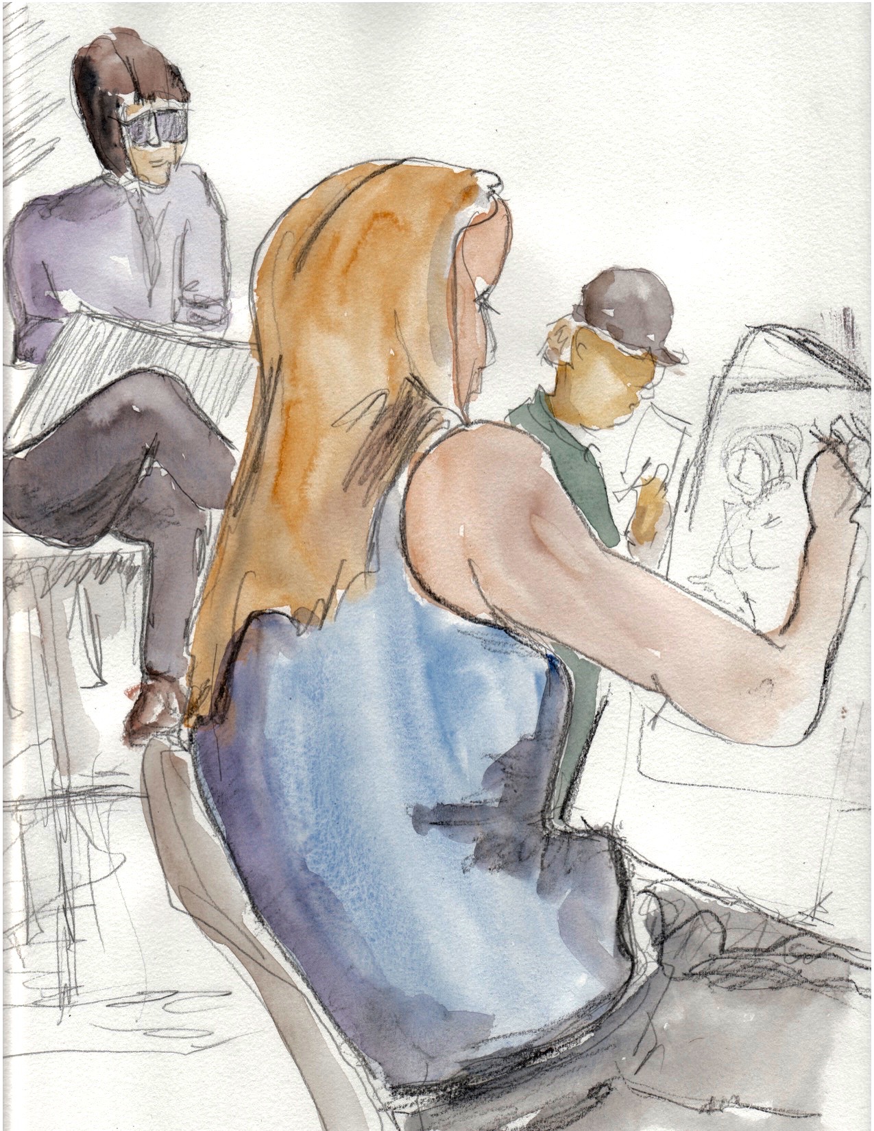 At open studio today I looked up from a sketch and noticed the focus and stamina of the artists. A few sketches later I noticed it again and decided to try to capture it. So for the last pose I sketched the sketchers. I have to admire how hard they worked through the end of the three-hour session. It is interesting how the proportion of time split between looking at the model and looking at the sketch changes across the twenty-minute pose. At first the three artists here hardly looked at their papers. Looking at this sketch now I wonder if I should have had all three artists looking up at the model. Would this have conveyed their focus a little more? I used pencil and watercolor.