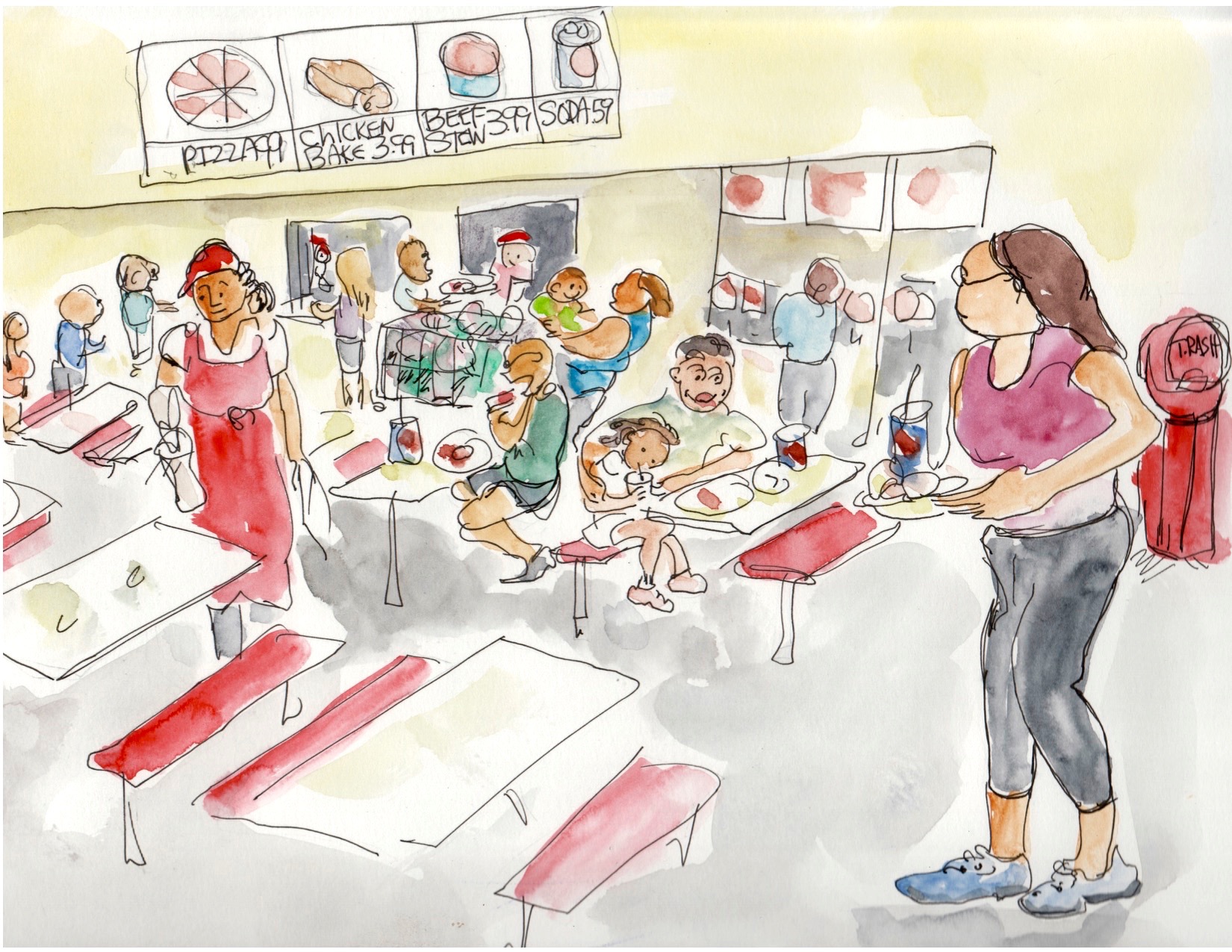 I went to Costco to sketch again, or did I go for the yogurt swirl? In any case I enjoyed both opportunities greatly. This is the same subject as my October 16 and October 20 posts. I wanted this sketch to show more commotion that the October 16 post shows, but less than the October 20 post. I also wanted to include the workers as their work is what makes it possible for so many different people to enjoy the food court. This sketch is cleaner and has more differentiation of the figures, I think, but still falls short of what I want to convey about eating at Costco. I really want to show small groups relating with each other over food and a few individuals enjoying the food alone. I may need to return for further sketching- and possibly more yogurt swirls.