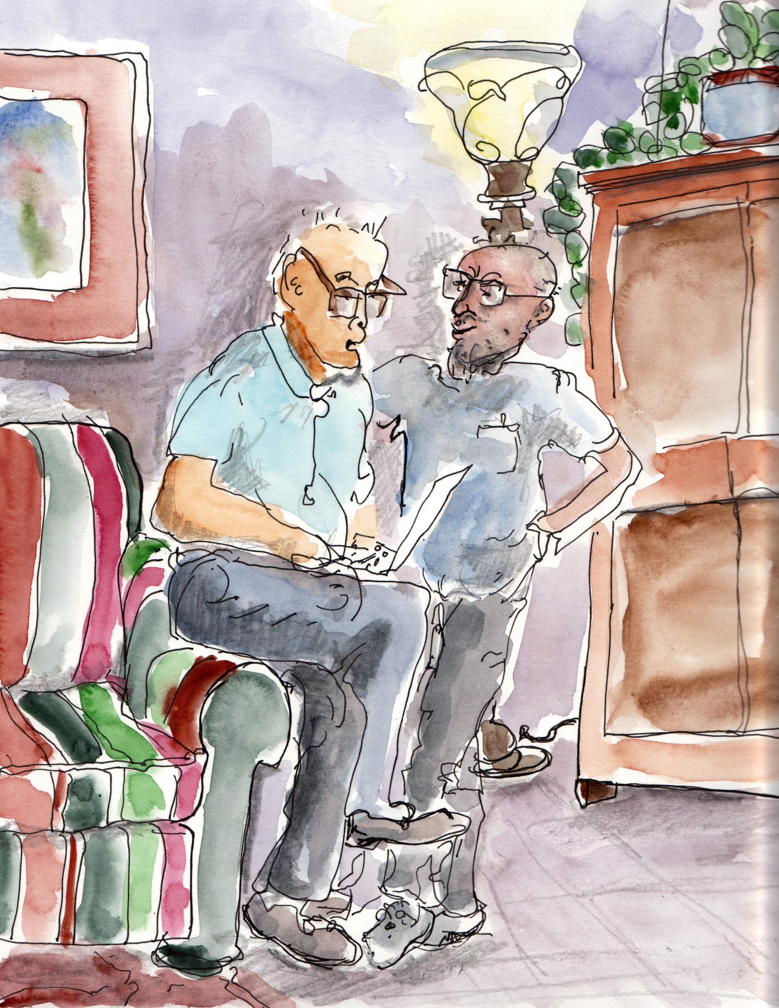 Two friends from childhood meet up and what do they talk about? Research papers, of course. I am fascinated by the look and expressions of learning and was delighted to again see it in front of me and to have the chance to describe it with images this evening. I noticed the body positions were casual. One figure looked directly at the computer and the second looked directly at the first, both showed curiosity and puzzlement. Both spoke and listened at the same time, neither giving nor taking offence. To me their interaction conveyed an old friendship based in the fun of exploring new ideas. I wish I could have made several more sketches of them to work out some of the challenges of the setting and proportions.