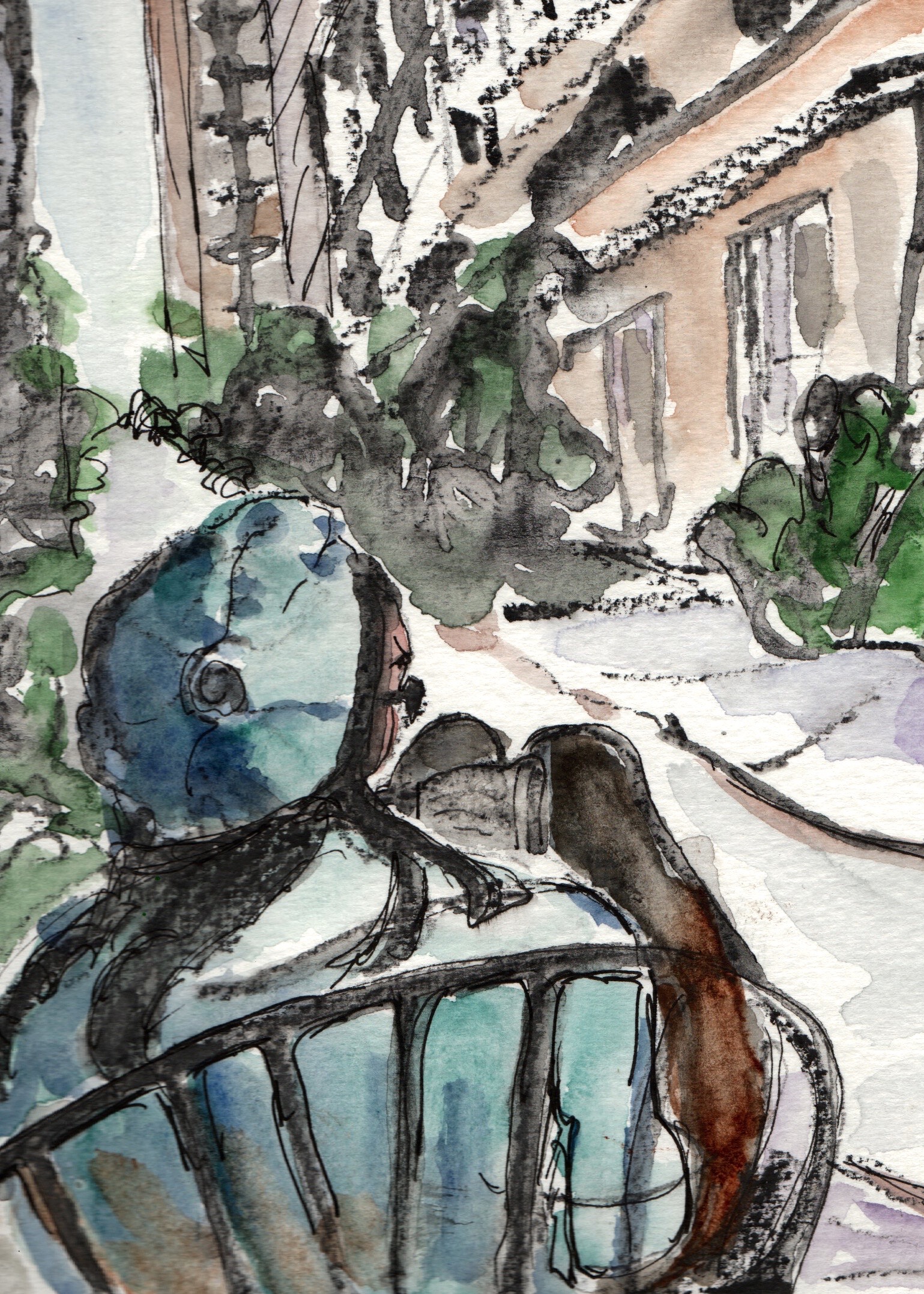 I am still not clear on perspective so I am taking a very helpful online Craftsy course, Perspective for Sketchers with Stephanie Bower. I am working on single point perspective and was trying to draw two streets on a hill disappearing into a common vanishing point when a young woman with a hat and a book came and sat directly in front of me. She curled up in the chair and this is what became of that sketch.