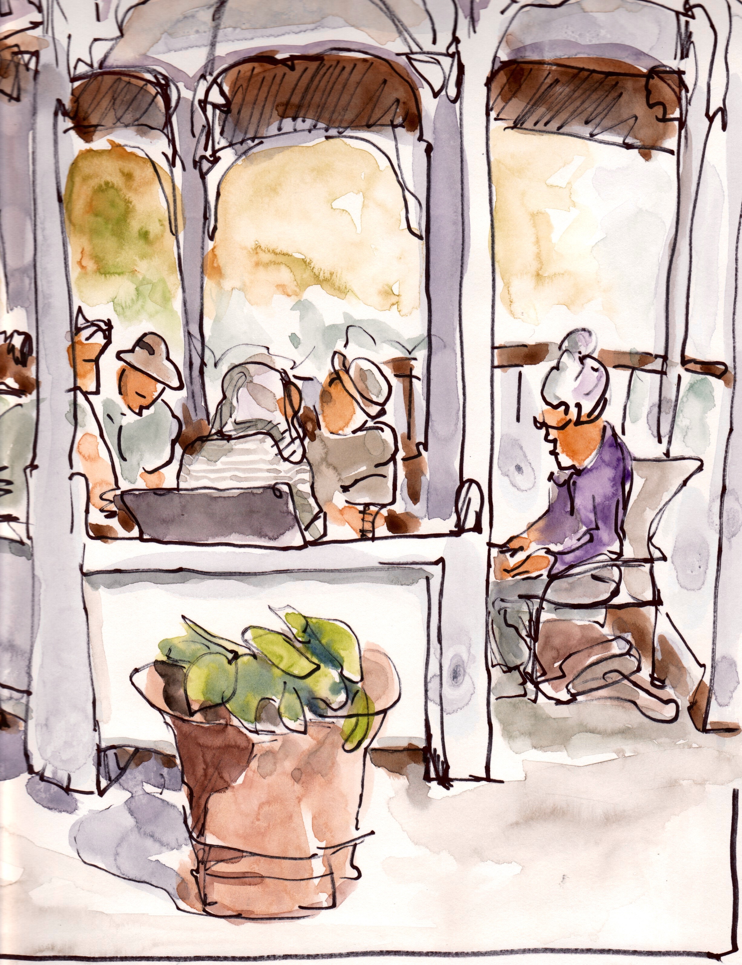 Two parts of the sketch were not intentional but I think both add to the message. First, because the style is a bit abstract, it is not clear what kind handwork is underway. It could be knitting, a book club reading, jewelry making, or sketching. To me this suggests something broad and universal about like-minded people getting together for a common goal. And second, I like the way the shape of the flowerpot echoes the figures in the gazebo. I wish I had exaggerated the size of the pot and shaped the leaves to be more like the shapes of the figures.