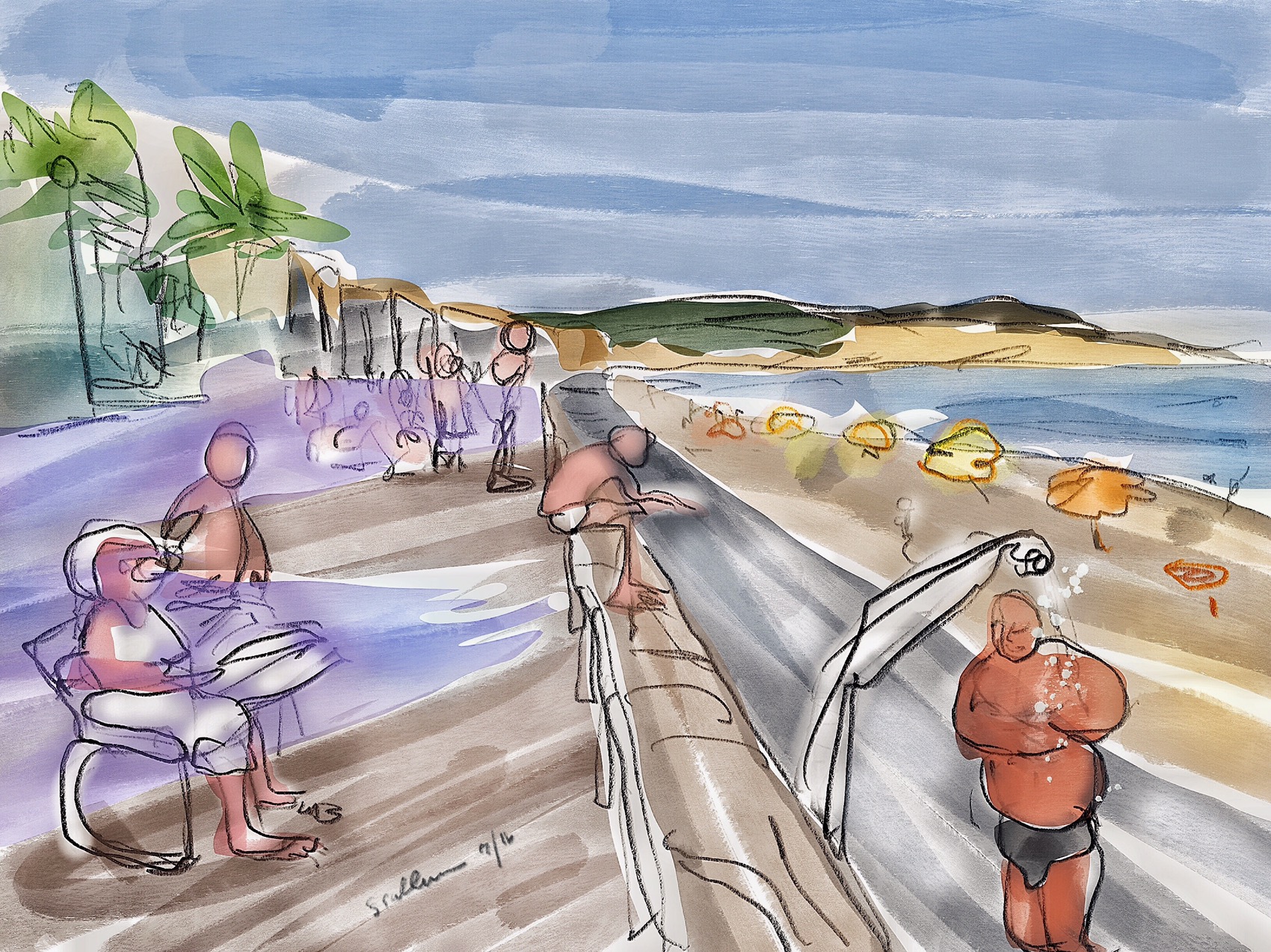 This is a quick sketch of people along the city beach using pencil on a small sheet of multimedia paper.  Later at the hotel I added color with Procreate and  used Snapseed to strengthen the texture.