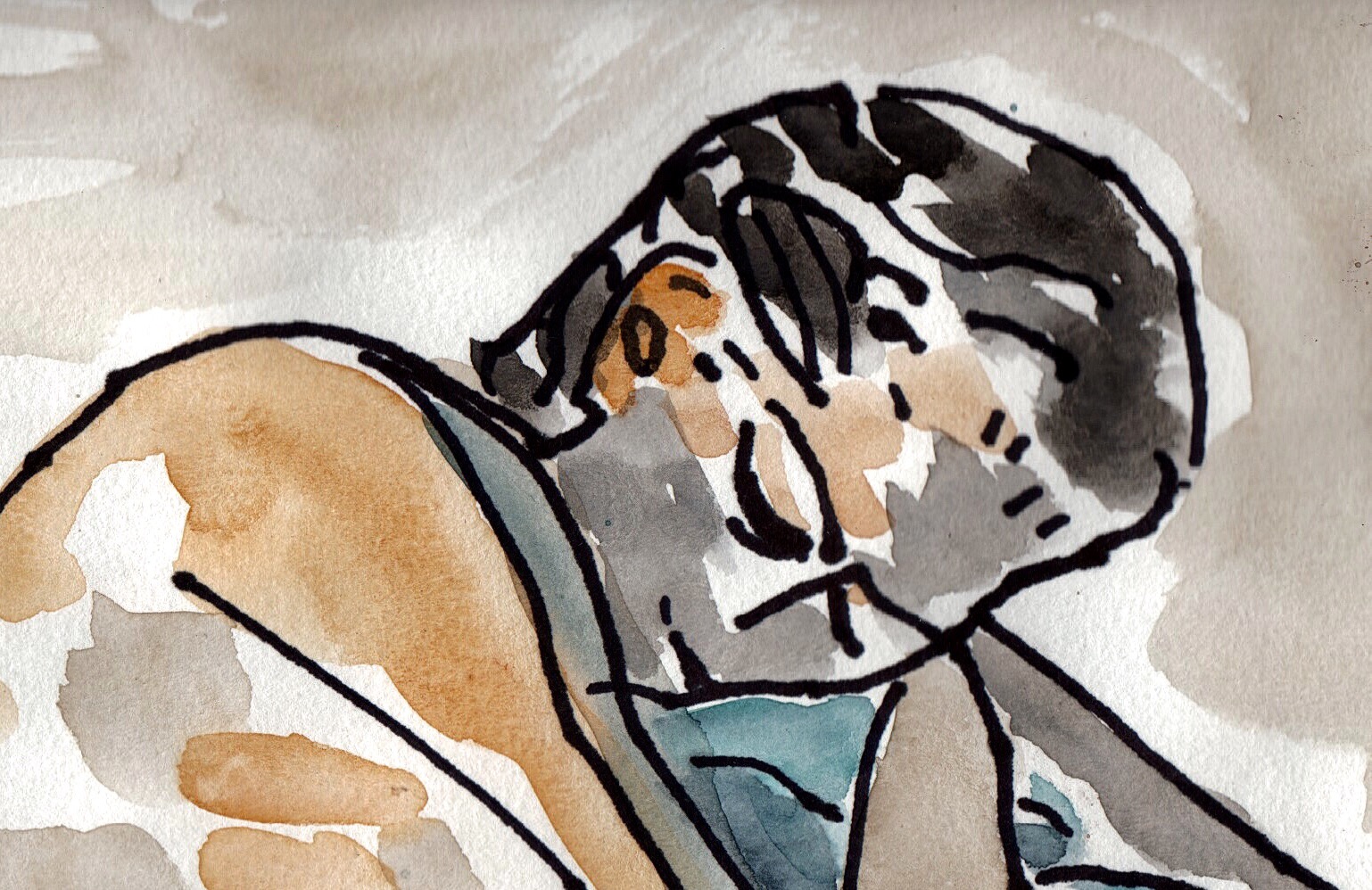 I took an overworked sketch from yesterday’s session with the North Park drawing group and used it as a reference for this sketch. Although my tendency is to completely fill a page with color, I now want to learn to use the white of the paper as a compositional element. So I let the white space of the paper define some of the woman’s features and used it as well to show how the light reflects on her face, arm and hair.