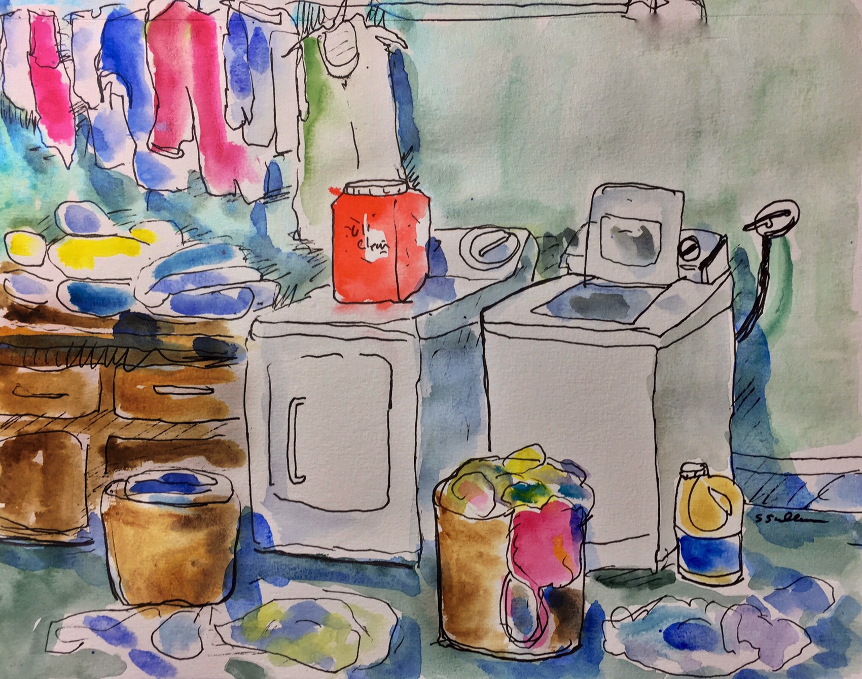 Sometimes I avoid laundry but after two weeks in a suitcase it is a pleasure to sort through and get everything clean and back in place. I sketched this twice but the first did not match my cheerful mood so I added more brights and think it captures the moment and my attitude.