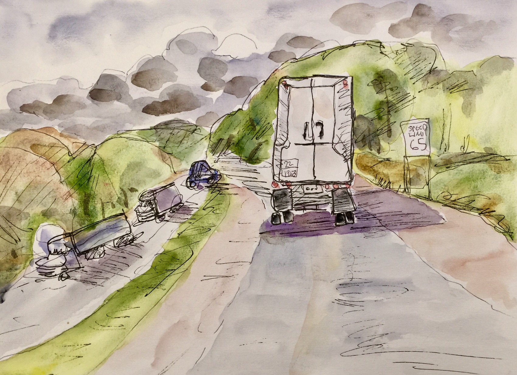 We made our way from Chicago to western New York before stopping for the night. This is one of several pen and watercolor sketches I did along the way. I composed it as we went along from the changing landscape as we drove.