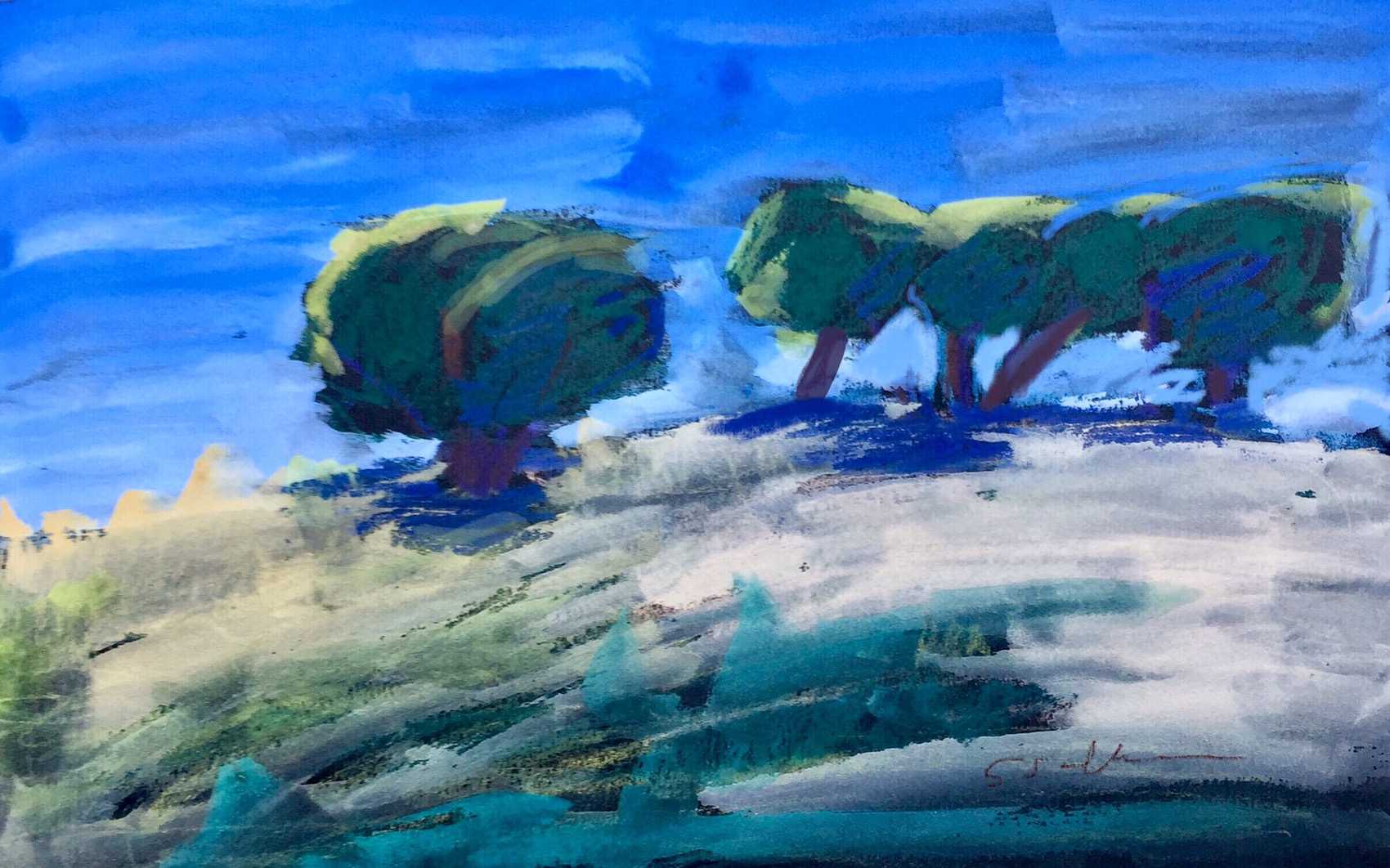 I drew as we drove from Austin to New Mexico today across a mesmerizing landscape. The trees, I think live oak trees, were thick near Austin, but the further we drove the more sparse they became. They were somewhat backlit against the blue sky and browning hills and just plain beautiful.