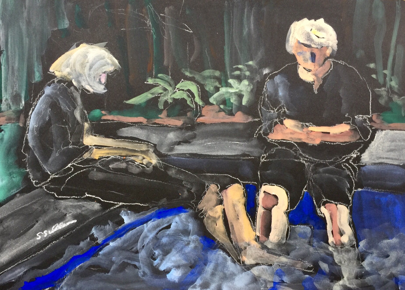 This is a pastel and gouache sketch on black paper.