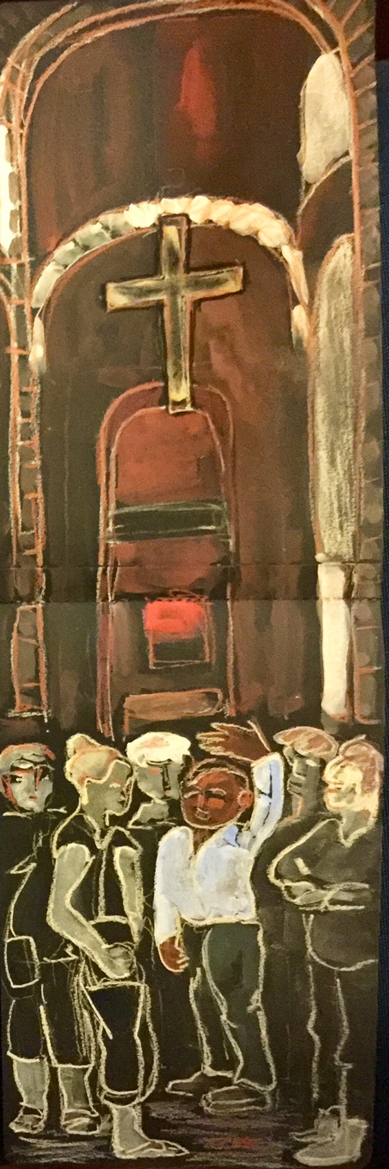 This is a pastel and gouache sketch on both sides of an 8 X 5 Moleskine notebook with black pages.