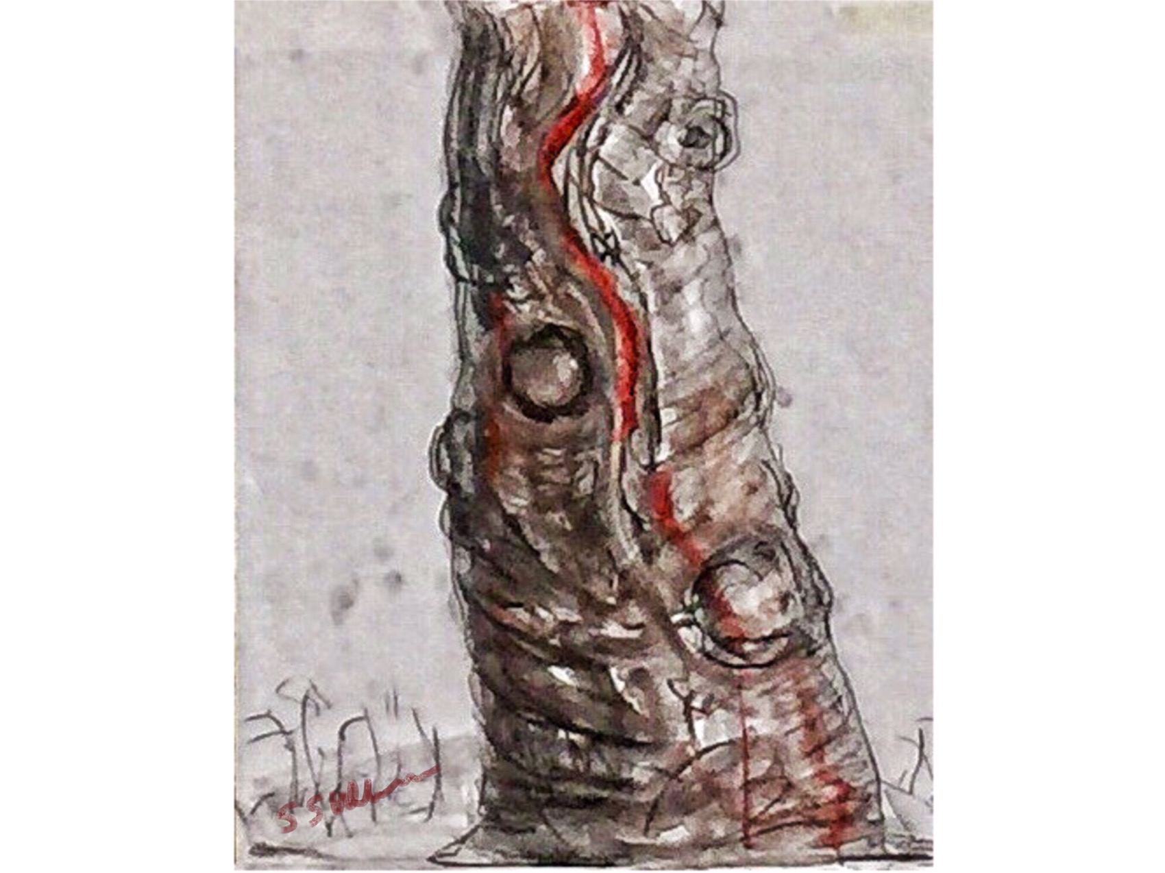 Sketching a close up of a tree trunk is an unusual choice of a subject for me as I mostly like to tell a story with my sketches. However, I was taking a class called, ‘Why Draw a Tree’ and we were looking closely at the parts of a tree. We used charcoal, conte crayon and erasers to show the rough texture of the bark.