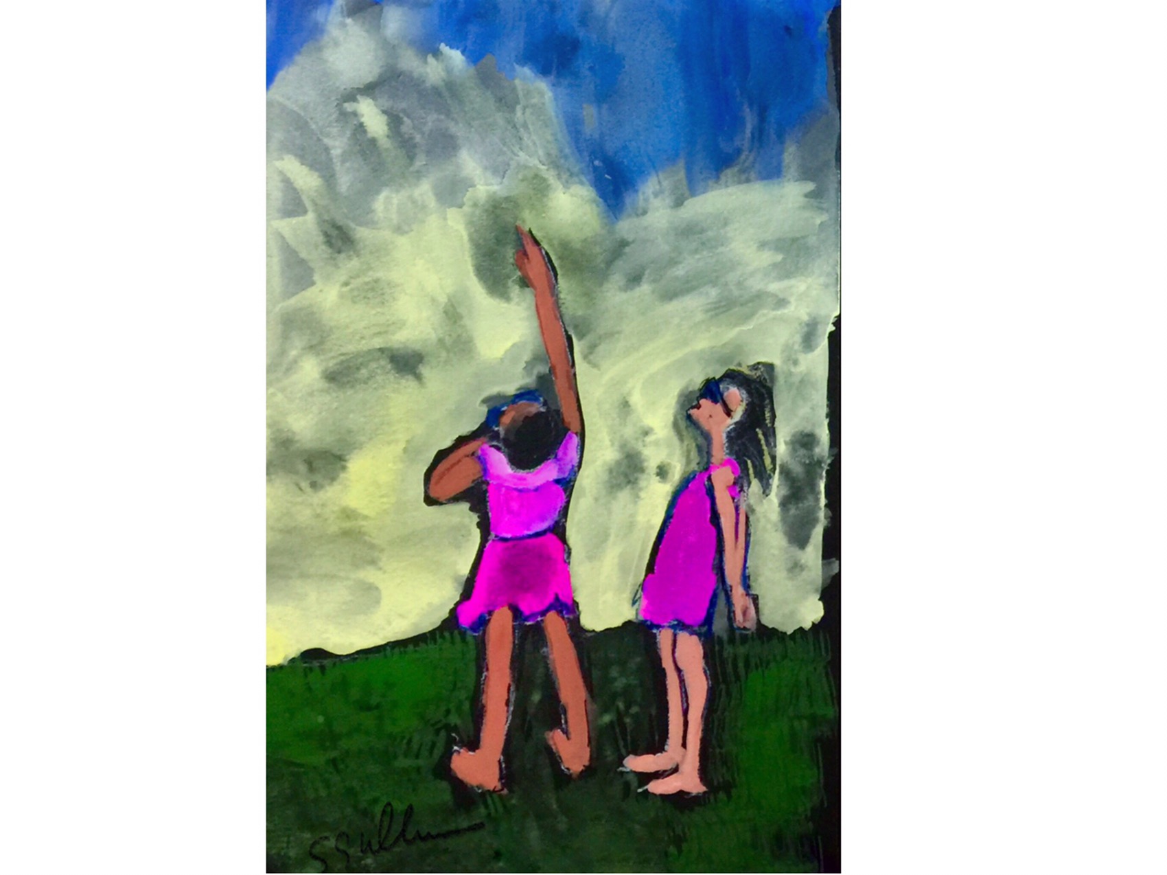 I wanted to make the sun far above the girls and so I used both sides of a Moleskine sketchbook.  The sketch is made with gouache and measures 5 X 18 inches. The image below is a closeup of the two friends.