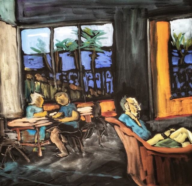 We, my brother, sister, brother-in-law, husband, and I, have been here in Mazatlan less that a day and already we are settling into relaxation mode- sleeping in, reading, playing Scrabble and sketching. Although I like this sketch because it caught a snapshot of our morning together, I did not get enough of a contrast between the bright outside light and the cool indoor light.