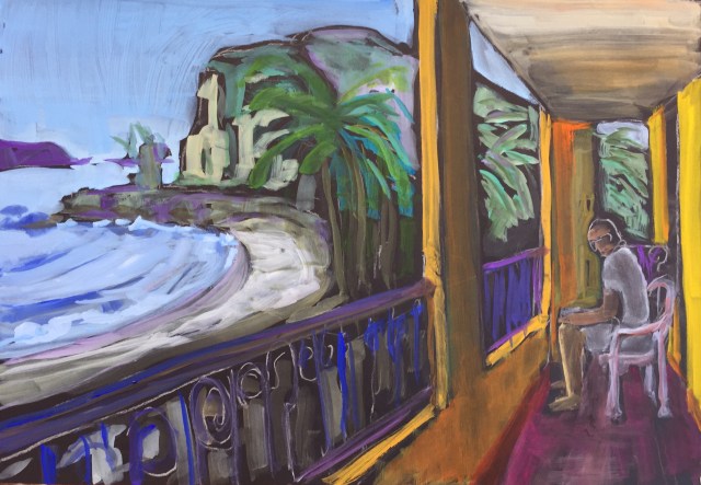 I am having fun chronicling our days but this sketch is also about trying to understand the light and colors of Mazatlan. This is a 12 X 17-inch gouache sketch on black paper.