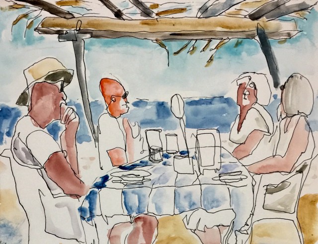 Yesterday we walked over to the harbor and then took a water taxi to Isla de las Piedras (Stone Island). The island is really a peninsula with a long sandy beach, gentle swimming, and casual restaurants. We walked, swam, sat, talked, ate, and enjoyed the setting.This is a pen and watercolor sketch of some people who sat near us.