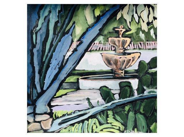 Back in San Diego, I got out to the Mission de San Diego Alcala. This is a a 9 X 9-inch gouache sketch of the fountain as seen through a massive aloe vera succelent.