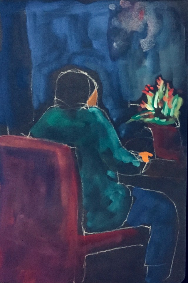 I haven’t sketched since leaving Hawaii for San Diego and then Phoenix so it felt really good to do a quick sketch of my sister this evening. She was working on a project at the table and I liked the shapes of the chair and her body against the darkness of the sliding door.