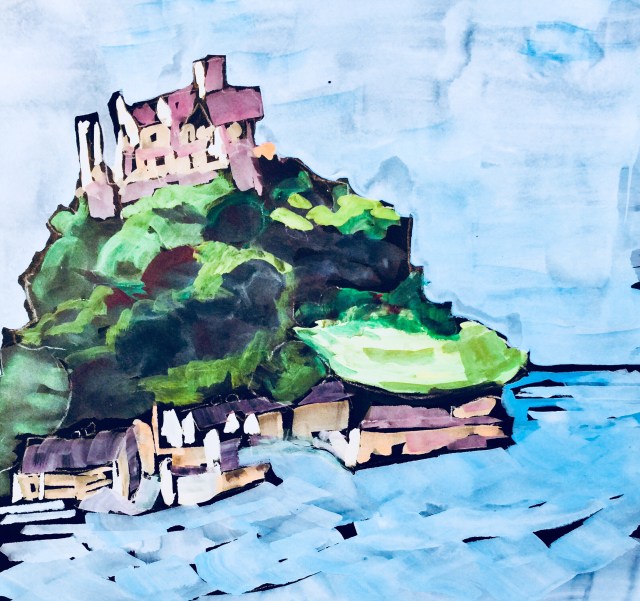 We have stopped for a few days in the small Cornish town of Marazion, known for St Michael’s Mount. St Michael’s Mount is a small tidal island topped off with a large castle. This sketch shows it during high tide. During low tide most of the water between the island and shore moves out and people walk back and forth between the island and town.