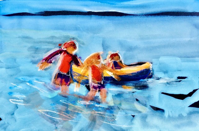 Although the climate in Cornwall is relatively mild, I tested the water and found I lacked the courage to join the many enthusiastic swimmers at Marazion’s coast. As I sketched instead, these three sisters caught my attention and made me remember how much fun I used to have playing in the water as a child.