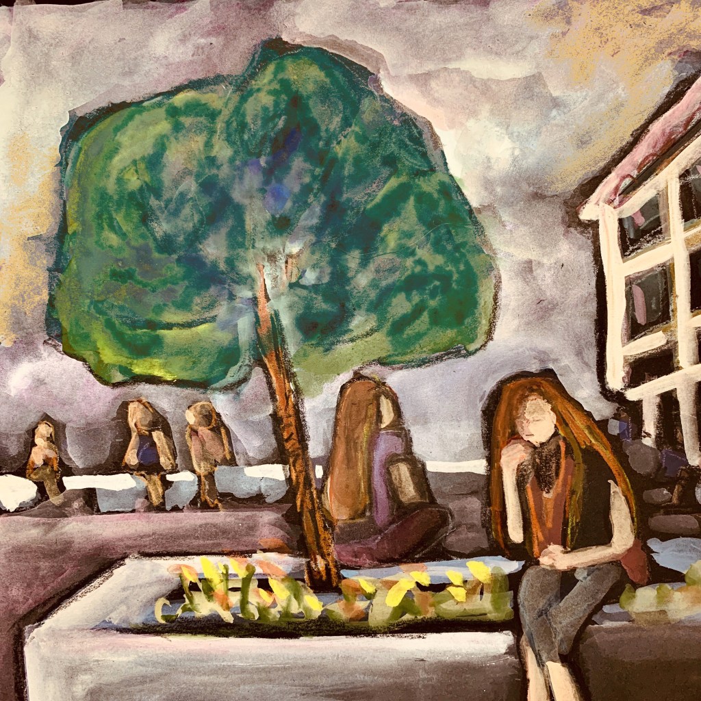 I am less impressed with adding the Inktense pencils over areas that I first painted with gouache. After the gouache dried, I colored over it with the pencils and then remoistened the marks with a wet brush. I was heavy handed with the Inktense pencils in the tree and less so in the sky. To be fair, I was clumsy with the technique, but so far think I can get a better look with only gouache.