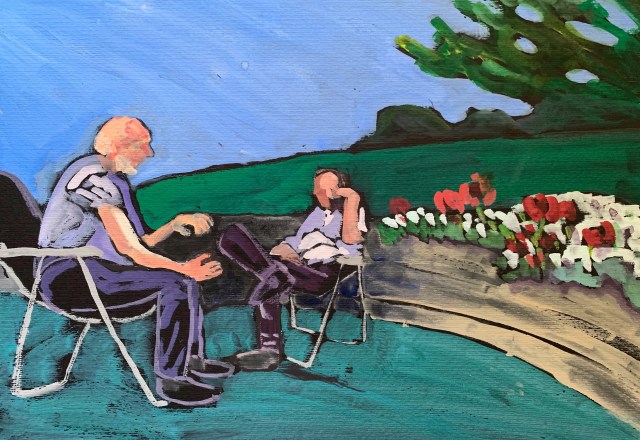 What could be nicer than two old friends chatting away a pleasant afternoon? I liked their relaxed body language, one sitting up and explaining while the other is leaning back, deep in his chair. It had the look of two people who were very comfortable with each other.