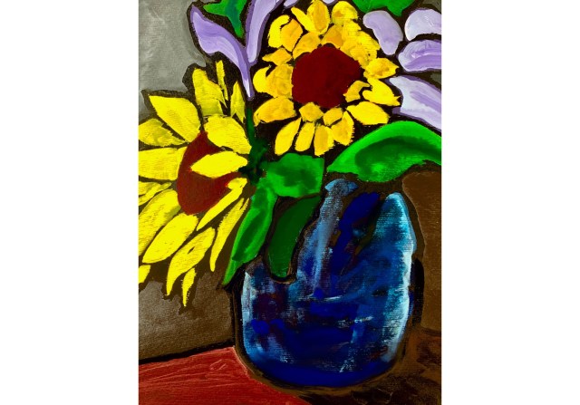 Travel is wonderful but it is ever so nice to be home again, especially with sunflowers and irises to keep me company while I adjust to this time zone. I wanted a simple focus and so exaggerated the large shapes of the flowers and vase and then blocked in fairly flat color.